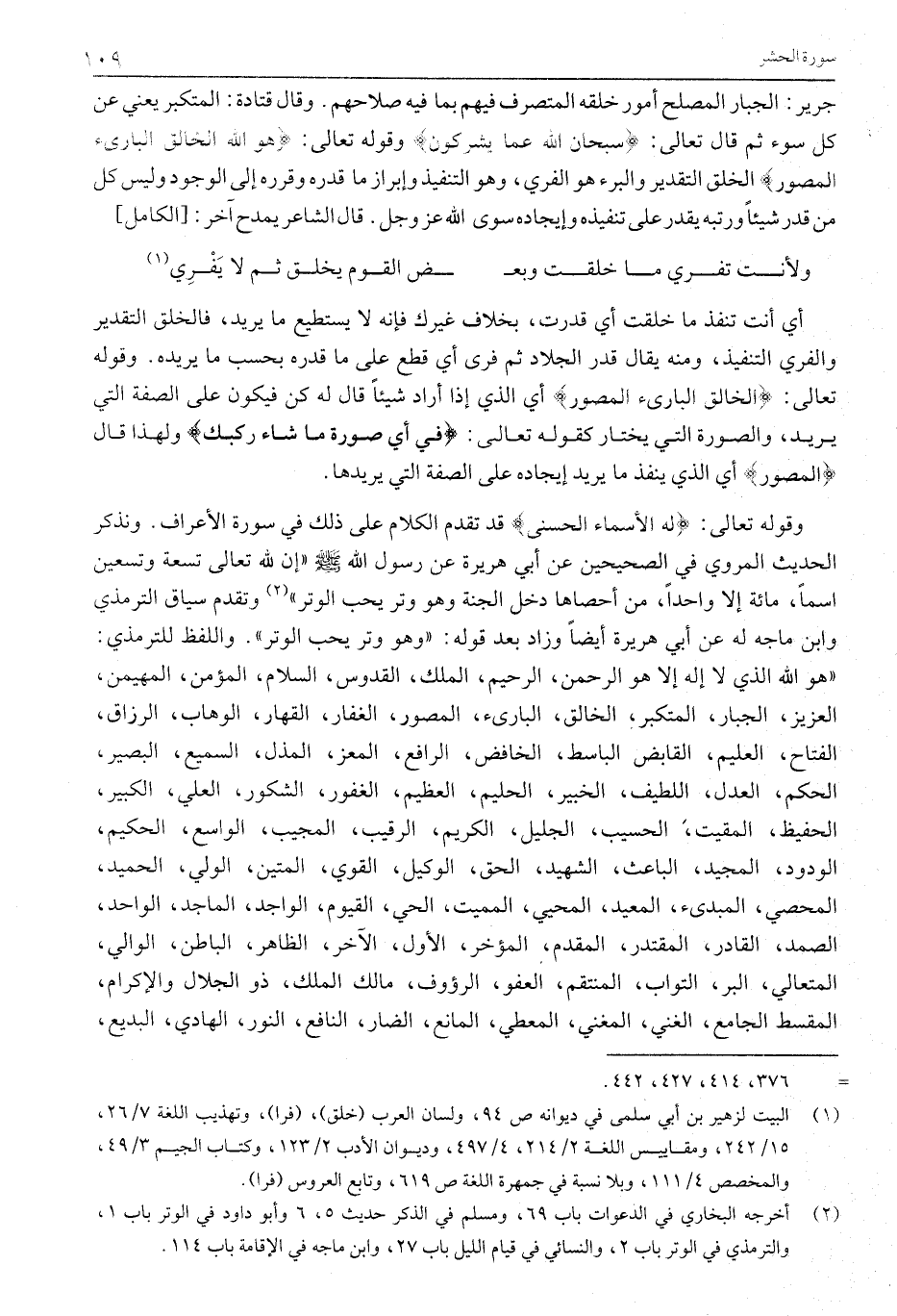 جَرِيرٍ: الْجَبَّارُ الْمُصْلِحُ أُمُورَ خَلْقِهِ الْمُتَصَرِّفُ فِيهِمْ بِمَا فِيهِ صَلَاحُهُمْ. وَقَالَ قَتَادَةُ: الْمُتَكَبِّرُ يَعْنِي عن كل سوء ثم قال تعالى: سُبْحانَ اللَّهِ عَمَّا يُشْرِكُونَ وقوله تعالى: هُوَ اللَّهُ الْخالِقُ الْبارِئُ الْمُصَوِّرُ الْخَلْقُ التَّقْدِيرُ والبرء هُوَ الْفَرْيُ، وَهُوَ التَّنْفِيذُ وَإِبْرَازُ مَا قَدَّرَهُ وَقَرَّرَهُ إِلَى الْوُجُودِ وَلَيْسَ كُلُّ مَنْ قَدَّرَ شَيْئًا وَرَتَّبَهُ يَقْدِرُ عَلَى تَنْفِيذِهِ وَإِيجَادِهِ سِوَى اللَّهِ عَزَّ وَجَلَّ. قَالَ الشَّاعِرُ يَمْدَحُ آخَرَ: [الكامل]