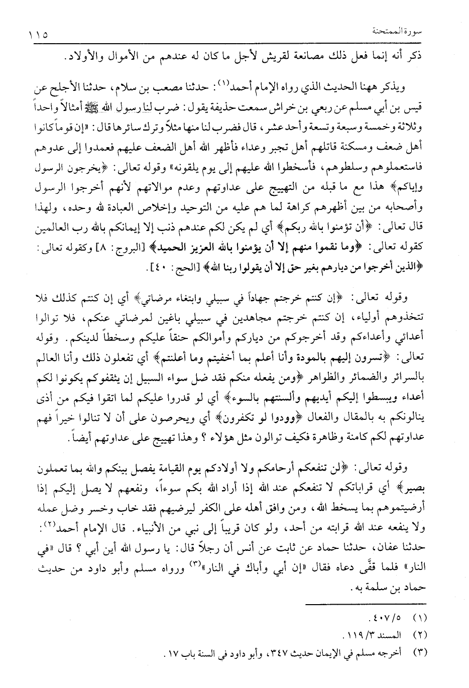 وقوله تعالى: لَنْ تَنْفَعَكُمْ أَرْحامُكُمْ وَلا أَوْلادُكُمْ يَوْمَ الْقِيامَةِ يَفْصِلُ بَيْنَكُمْ وَاللَّهُ بِما تَعْمَلُونَ بَصِيرٌ أَيْ قَرَابَاتُكُمْ لَا تَنْفَعُكُمْ عِنْدَ اللَّهِ إِذَا أَرَادَ اللَّهُ بِكُمْ سُوءًا، وَنَفْعُهُمْ لَا يَصِلُ إِلَيْكُمْ إِذَا أَرْضَيْتُمُوهُمْ بِمَا يُسْخِطُ اللَّهَ، وَمَنْ وَافَقَ أَهْلَهُ عَلَى الْكُفْرِ لِيُرْضِيَهُمْ فَقَدْ خَابَ وَخَسِرَ وَضَلَّ عَمَلُهُ وَلَا يَنْفَعُهُ عِنْدَ اللَّهِ قَرَابَتُهُ مِنْ أَحَدٍ، وَلَوْ كَانَ قَرِيبًا إِلَى نَبِيٍّ مِنَ الْأَنْبِيَاءِ. قَالَ الْإِمَامُ أَحْمَدُ «2» :