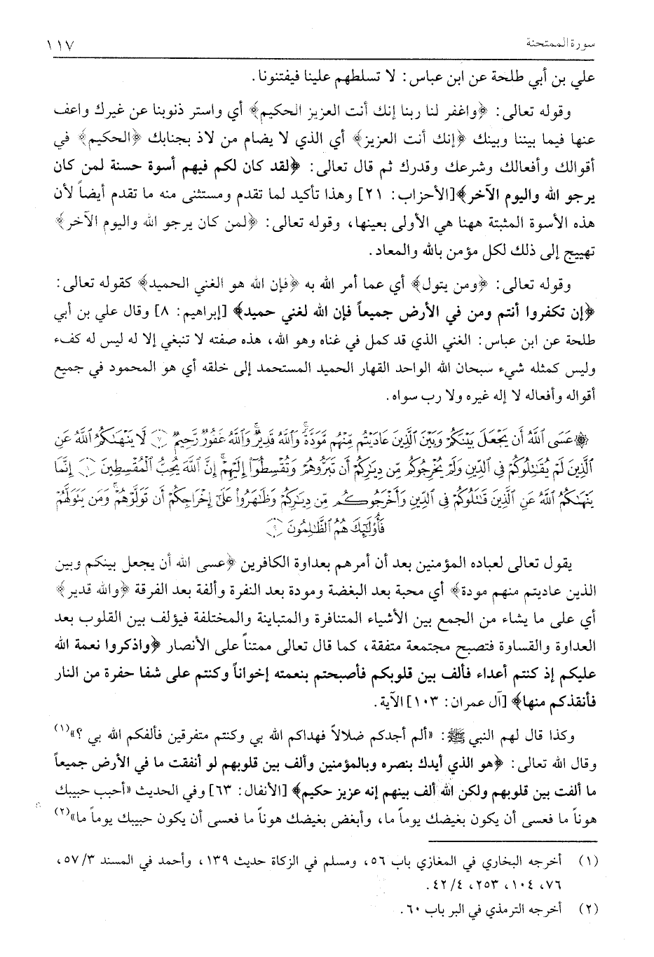 عَسَى اللَّهُ أَنْ يَجْعَلَ بَيْنَكُمْ وَبَيْنَ الَّذِينَ عادَيْتُمْ مِنْهُمْ مَوَدَّةً وَاللَّهُ قَدِيرٌ وَاللَّهُ غَفُورٌ رَحِيمٌ (7) لَا يَنْهاكُمُ اللَّهُ عَنِ الَّذِينَ لَمْ يُقاتِلُوكُمْ فِي الدِّينِ وَلَمْ يُخْرِجُوكُمْ مِنْ دِيارِكُمْ أَنْ تَبَرُّوهُمْ وَتُقْسِطُوا إِلَيْهِمْ إِنَّ اللَّهَ يُحِبُّ الْمُقْسِطِينَ (8) إِنَّما يَنْهاكُمُ اللَّهُ عَنِ الَّذِينَ قاتَلُوكُمْ فِي الدِّينِ وَأَخْرَجُوكُمْ مِنْ دِيارِكُمْ وَظاهَرُوا عَلى إِخْراجِكُمْ أَنْ تَوَلَّوْهُمْ وَمَنْ يَتَوَلَّهُمْ فَأُولئِكَ هُمُ الظَّالِمُونَ (9)
