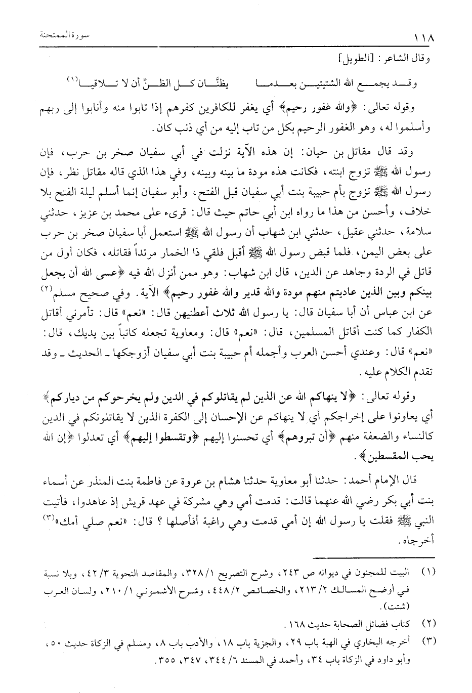 وَقَوْلُهُ تَعَالَى: لَا يَنْهاكُمُ اللَّهُ عَنِ الَّذِينَ لَمْ يُقاتِلُوكُمْ فِي الدِّينِ وَلَمْ يُخْرِجُوكُمْ مِنْ دِيارِكُمْ أي يعاونوا على إخراجكم أَيْ لَا يَنْهَاكُمْ عَنِ الْإِحْسَانِ إِلَى الْكَفَرَةِ الَّذِينَ لَا يُقَاتِلُونَكُمْ فِي الدِّينِ كَالنِّسَاءِ وَالضَّعَفَةِ مِنْهُمْ أَنْ تَبَرُّوهُمْ أَيْ تُحْسِنُوا إِلَيْهِمْ وَتُقْسِطُوا إِلَيْهِمْ أَيْ تَعْدِلُوا إِنَّ اللَّهَ يُحِبُّ الْمُقْسِطِينَ.