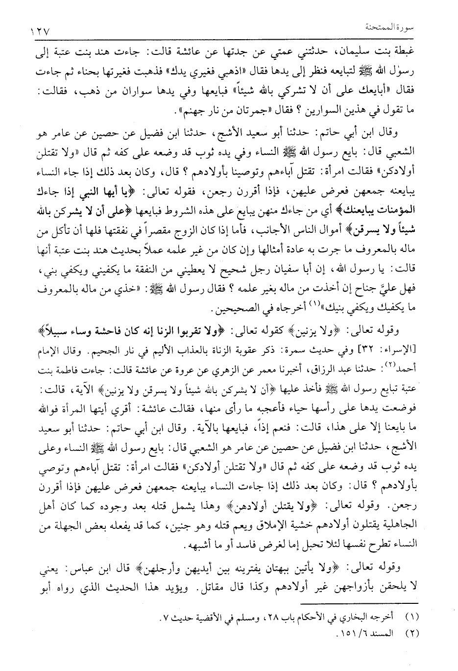 وقوله تعالى: وَلا يَزْنِينَ كقوله تعالى: وَلا تَقْرَبُوا الزِّنى إِنَّهُ كانَ فاحِشَةً وَساءَ سَبِيلًا [الْإِسْرَاءِ: 32] وَفِي حَدِيثِ سَمُرَةَ: ذِكْرُ عُقُوبَةِ الزُّنَاةِ بِالْعَذَابِ الْأَلِيمِ فِي نَارِ الْجَحِيمِ. وَقَالَ الْإِمَامُ أَحْمَدُ «2» : حَدَّثَنَا عَبْدُ الرَّزَّاقِ، أَخْبَرَنَا مَعْمَرٌ عَنِ الزُّهْرِيِّ عَنْ عُرْوَةَ عَنْ عَائِشَةَ قَالَتْ: جَاءَتْ فَاطِمَةُ بِنْتُ عُتْبَةَ تُبَايِعُ رَسُولُ اللَّهِ صَلَّى اللَّهُ عَلَيْهِ وَسَلَّمَ فَأَخَذَ عَلَيْهَا أَنْ لَا يُشْرِكْنَ بِاللَّهِ شَيْئاً وَلا يَسْرِقْنَ وَلا يَزْنِينَ الْآيَةَ، قَالَتْ: