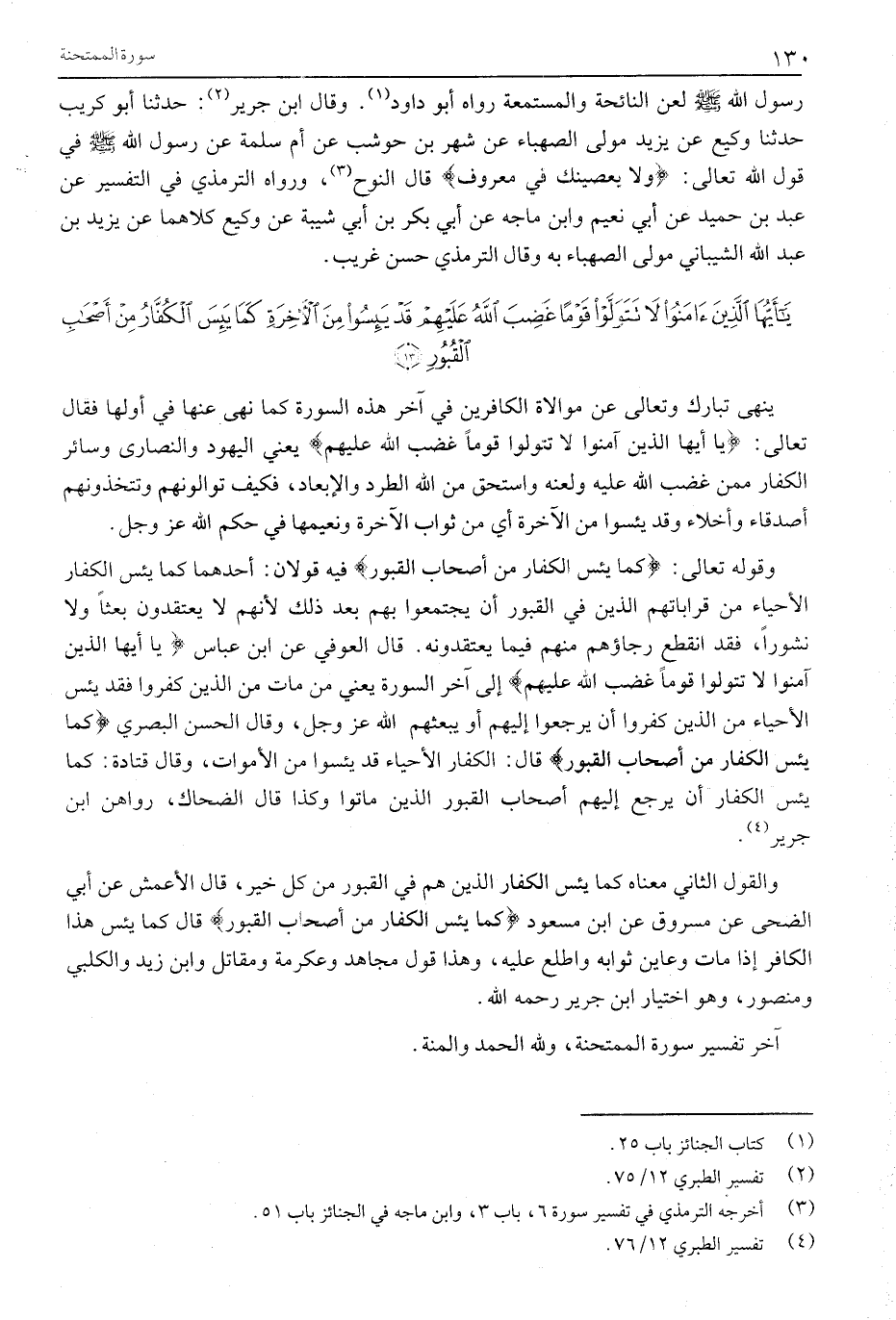 وقوله تعالى: كَما يَئِسَ الْكُفَّارُ مِنْ أَصْحابِ الْقُبُورِ فِيهِ قَوْلَانِ: أَحَدُهُمَا كَمَا يَئِسَ الْكُفَّارُ الْأَحْيَاءُ مِنْ قَرَابَاتِهِمُ الَّذِينَ فِي الْقُبُورِ أَنْ يَجْتَمِعُوا بِهِمْ بَعْدَ ذَلِكَ لِأَنَّهُمْ لَا يَعْتَقِدُونَ بَعْثًا وَلَا نُشُورًا، فَقَدِ انْقَطَعَ رَجَاؤُهُمْ مِنْهُمْ فِيمَا يَعْتَقِدُونَهُ. قَالَ الْعَوْفِيُّ عَنِ ابْنِ عَبَّاسٍ يَا أَيُّهَا الَّذِينَ آمَنُوا لَا تَتَوَلَّوْا قَوْماً غَضِبَ اللَّهُ عَلَيْهِمْ إِلَى آخِرِ السُّورَةِ يَعْنِي مَنْ مَاتَ مِنَ الَّذِينَ كَفَرُوا فَقَدْ يَئِسَ الْأَحْيَاءُ مِنَ الَّذِينَ كَفَرُوا أَنْ يَرْجِعُوا إِلَيْهِمْ أَوْ يَبْعَثَهُمُ اللَّهُ عَزَّ وَجَلَّ، وَقَالَ الْحَسَنُ الْبَصْرِيُّ كَما يَئِسَ الْكُفَّارُ مِنْ أَصْحابِ الْقُبُورِ قَالَ: الْكُفَّارُ الْأَحْيَاءُ قَدْ يَئِسُوا مِنَ الْأَمْوَاتِ، وَقَالَ قَتَادَةُ: كَمَا يَئِسَ الْكُفَّارُ أَنْ يَرْجِعَ إِلَيْهِمْ أَصْحَابُ الْقُبُورِ الَّذِينَ مَاتُوا وَكَذَا قَالَ الضَّحَّاكُ، رَوَاهُنَّ ابْنُ جَرِيرٍ «4» .