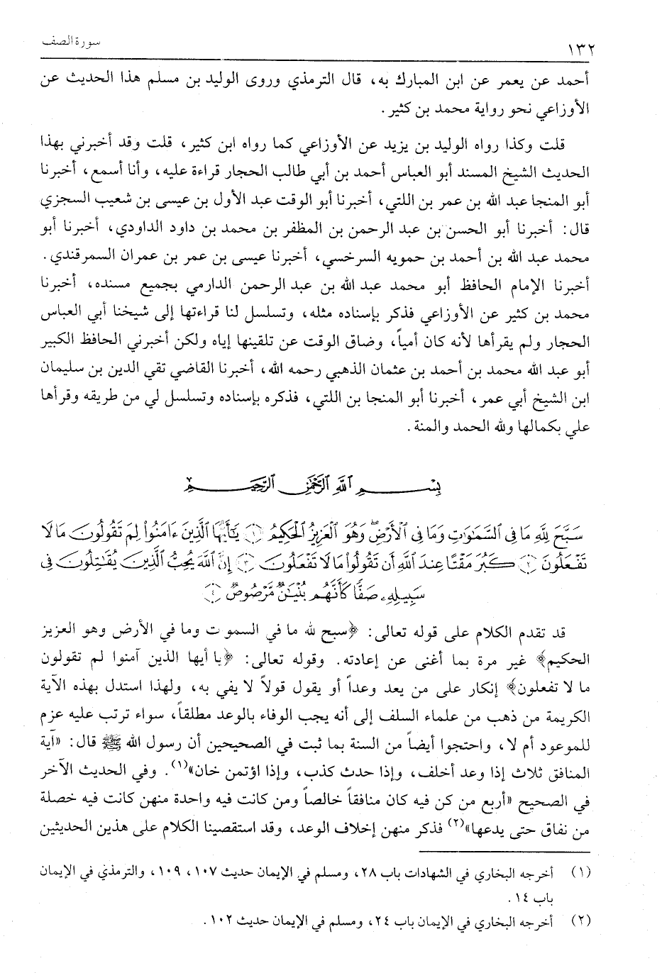 سَبَّحَ لِلَّهِ مَا فِي السَّماواتِ وَما فِي الْأَرْضِ وَهُوَ الْعَزِيزُ الْحَكِيمُ (1) يَا أَيُّهَا الَّذِينَ آمَنُوا لِمَ تَقُولُونَ مَا لَا تَفْعَلُونَ (2) كَبُرَ مَقْتاً عِنْدَ اللَّهِ أَنْ تَقُولُوا مَا لَا تَفْعَلُونَ (3) إِنَّ اللَّهَ يُحِبُّ الَّذِينَ يُقاتِلُونَ فِي سَبِيلِهِ صَفًّا كَأَنَّهُمْ بُنْيانٌ مَرْصُوصٌ (4)