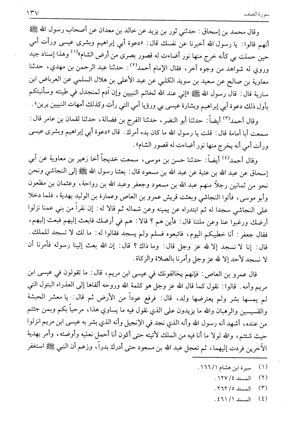 وَقَالَ مُحَمَّدُ بْنُ إِسْحَاقَ: حَدَّثَنِي ثَوْرُ بْنُ يَزِيدَ عَنْ خَالِدِ بْنِ مَعْدَانَ عَنْ أَصْحَابِ رَسُولِ اللَّهِ صَلَّى اللَّهُ عَلَيْهِ وَسَلَّمَ أَنَّهُمْ قالوا: يا رسول الله صلّى الله عليه وسلّم أَخْبِرْنَا عَنْ نَفْسِكَ قَالَ: «دَعْوَةُ أَبِي إِبْرَاهِيمَ وَبُشْرَى عِيسَى وَرَأَتْ أُمِّي حِينَ حَمَلَتْ بِي كَأَنَّهُ خَرَجَ مِنْهَا نُورٌ أَضَاءَتْ لَهُ قُصُورُ بُصْرَى مِنْ أَرْضِ الشَّامِ» «1» وَهَذَا إِسْنَادٌ جَيِّدٌ وَرُوِيَ لَهُ شَوَاهِدُ مِنْ وُجُوهٍ أُخَرَ، فَقَالَ الْإِمَامُ أَحْمَدُ «2» : حَدَّثَنَا عَبْدُ الرَّحْمَنِ بْنُ مَهْدِيٍّ، حَدَّثَنَا مُعَاوِيَةُ بْنُ صَالِحٍ عَنْ سَعِيدِ بْنِ سُوَيْدٍ الْكَلْبِيِّ عَنْ عَبْدِ الْأَعْلَى بْنِ هِلَالٍ السلمي عن العرباض ابن سَارِيَةَ قَالَ: قَالَ رَسُولُ اللَّهِ صَلَّى اللَّهُ عَلَيْهِ وَسَلَّمَ «إِنِّي عِنْدَ اللَّهِ لَخَاتَمُ النَّبِيِّينَ وَإِنَّ آدَمَ لَمُنْجَدِلٌ فِي طِينَتِهِ وَسَأُنْبِئُكُمْ بِأَوَّلِ ذَلِكَ دَعْوَةُ أَبِي إِبْرَاهِيمَ وَبِشَارَةُ عِيسَى بِي وَرُؤْيَا أُمِّي الَّتِي رَأَتْ وَكَذَلِكَ أُمَّهَاتُ النَّبِيِّينَ يَرَيْنَ» .