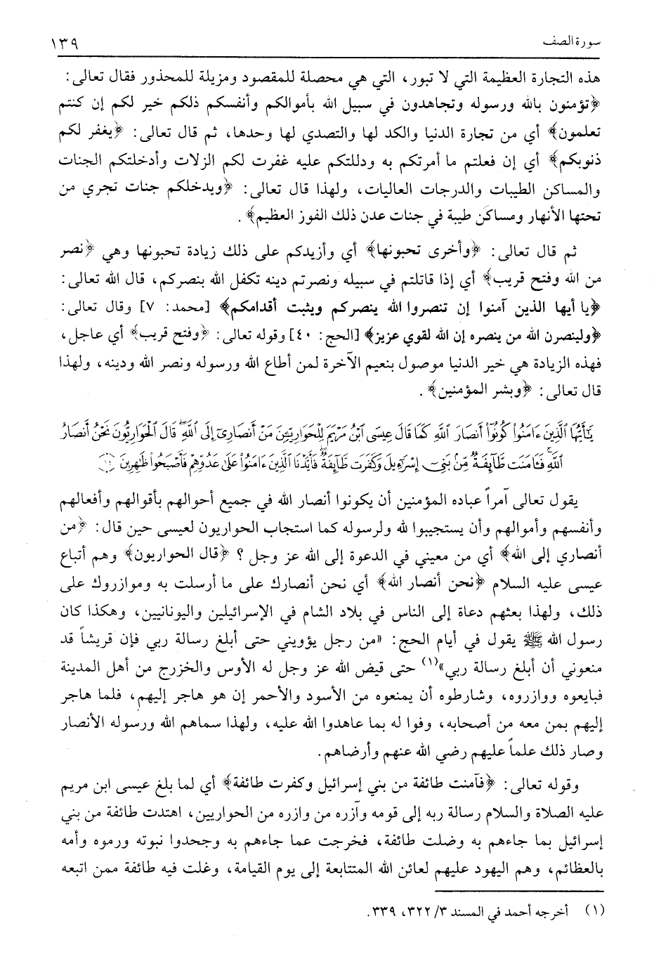 يَا أَيُّهَا الَّذِينَ آمَنُوا كُونُوا أَنْصارَ اللَّهِ كَما قالَ عِيسَى ابْنُ مَرْيَمَ لِلْحَوارِيِّينَ مَنْ أَنْصارِي إِلَى اللَّهِ قالَ الْحَوارِيُّونَ نَحْنُ أَنْصارُ اللَّهِ فَآمَنَتْ طائِفَةٌ مِنْ بَنِي إِسْرائِيلَ وَكَفَرَتْ طائِفَةٌ فَأَيَّدْنَا الَّذِينَ آمَنُوا عَلى عَدُوِّهِمْ فَأَصْبَحُوا ظاهِرِينَ (14)