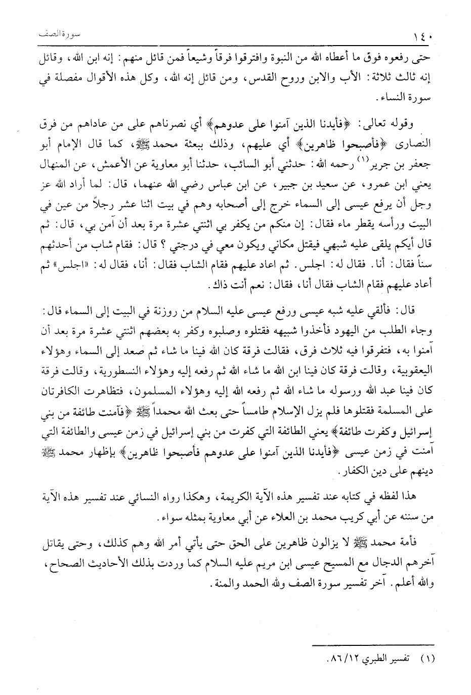 وَجَاءَ الطَّلَبُ من اليهود فأخذوا شبيهه فَقَتَلُوهُ وَصَلَبُوهُ وَكَفَرَ بِهِ بَعْضُهُمُ اثْنَتَيْ عَشْرَةَ مَرَّةً بَعْدَ أن آمنوا بِهِ، فَتَفَرَّقُوا فِيهِ ثَلَاثَ فِرَقٍ، فَقَالَتْ فِرْقَةٌ كَانَ اللَّهُ فِينَا مَا شَاءَ ثُمَّ صَعِدَ إِلَى السَّمَاءِ وَهَؤُلَاءِ الْيَعْقُوبِيَةُ، وَقَالَتْ فِرْقَةٌ كَانَ فينا ابن الله مَا شَاءَ اللَّهُ ثُمَّ رَفَعَهُ إِلَيْهِ وَهَؤُلَاءِ النُّسْطُورِيَّةُ، وَقَالَتْ فِرْقَةٌ كَانَ فِينَا عَبْدُ اللَّهِ ورسوله ما شاء الله ثُمَّ رَفَعَهُ اللَّهُ إِلَيْهِ وَهَؤُلَاءِ الْمُسْلِمُونَ، فَتَظَاهَرَتِ الْكَافِرَتَانِ عَلَى الْمُسْلِمَةِ فَقَتَلُوهَا فَلَمْ يَزَلِ الْإِسْلَامُ طَامِسًا حَتَّى بَعَثَ اللَّهُ مُحَمَّدًا صَلَّى اللَّهُ عَلَيْهِ وَسَلَّمَ فَآمَنَتْ طائِفَةٌ مِنْ بَنِي إِسْرائِيلَ وَكَفَرَتْ طائِفَةٌ يَعْنِي الطَّائِفَةَ الَّتِي كَفَرَتْ مِنْ بَنِي إِسْرَائِيلَ فِي زَمَنِ عِيسَى وَالطَّائِفَةَ الَّتِي آمَنَتْ فِي زَمَنِ عِيسَى فَأَيَّدْنَا الَّذِينَ آمَنُوا عَلى عَدُوِّهِمْ فَأَصْبَحُوا ظاهِرِينَ بِإِظْهَارِ مُحَمَّدٍ صَلَّى اللَّهُ عَلَيْهِ وَسَلَّمَ دينهم على دين الكفار.