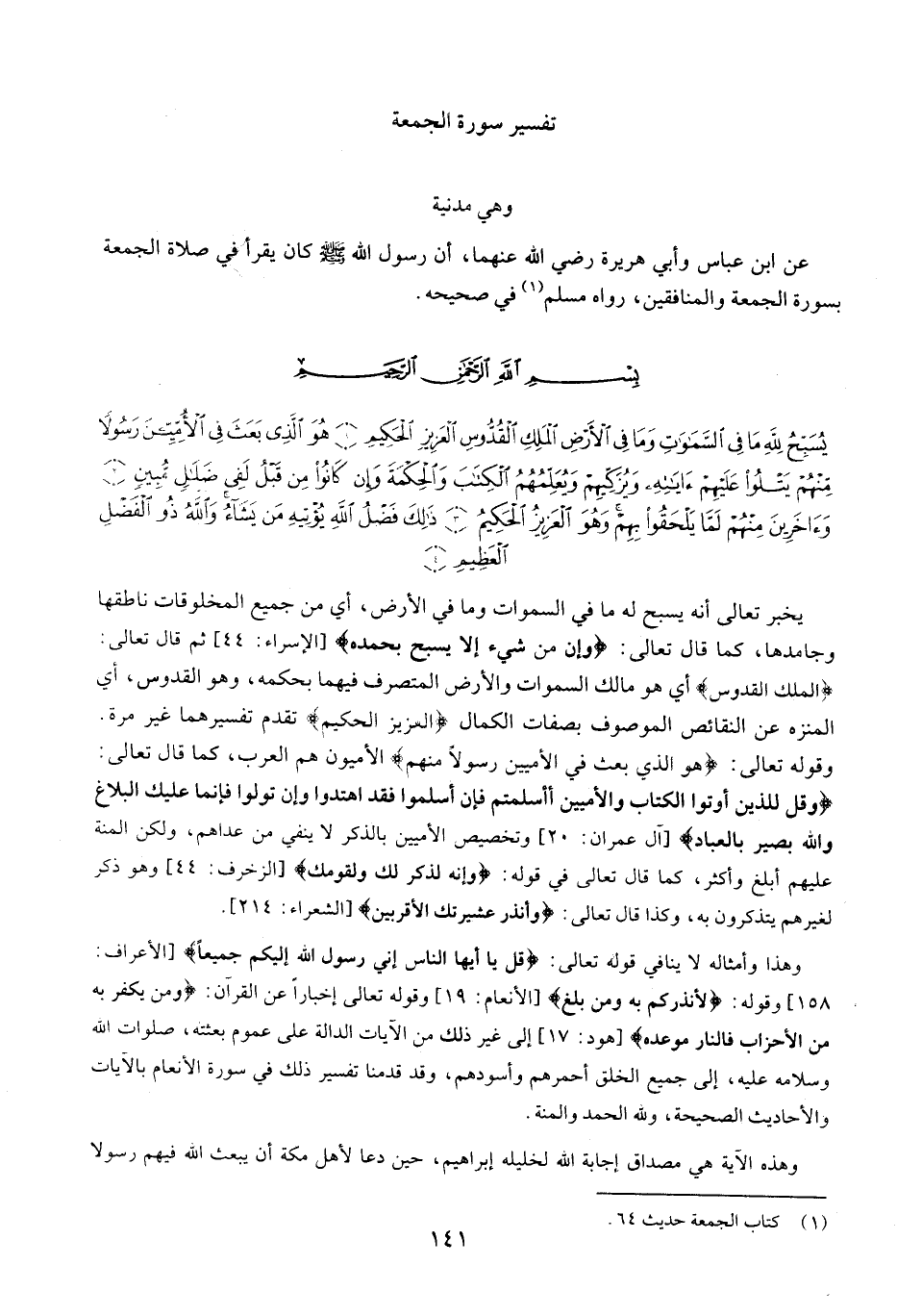 يُسَبِّحُ لِلَّهِ مَا فِي السَّماواتِ وَما فِي الْأَرْضِ الْمَلِكِ الْقُدُّوسِ الْعَزِيزِ الْحَكِيمِ (1) هُوَ الَّذِي بَعَثَ فِي الْأُمِّيِّينَ رَسُولاً مِنْهُمْ يَتْلُوا عَلَيْهِمْ آياتِهِ وَيُزَكِّيهِمْ وَيُعَلِّمُهُمُ الْكِتابَ وَالْحِكْمَةَ وَإِنْ كانُوا مِنْ قَبْلُ لَفِي ضَلالٍ مُبِينٍ (2) وَآخَرِينَ مِنْهُمْ لَمَّا يَلْحَقُوا بِهِمْ وَهُوَ الْعَزِيزُ الْحَكِيمُ (3) ذلِكَ فَضْلُ اللَّهِ يُؤْتِيهِ مَنْ يَشاءُ وَاللَّهُ ذُو الْفَضْلِ الْعَظِيمِ (4)