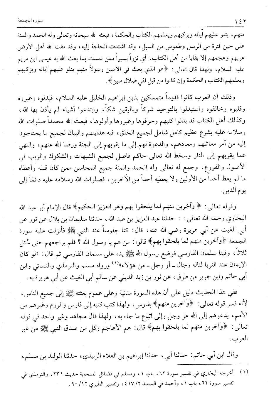 (1) أخرجه البخاري في تفسير سورة 62، باب 1، ومسلم في فضائل الصحابة حديث 231، والترمذي في تفسير سورة 62، باب 1، وأحمد في المسند 2/ 417، وتفسير الطبري 12/ 90.
