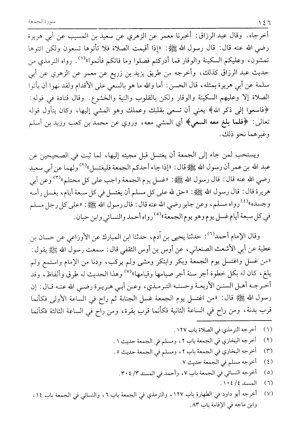 «مَنْ غَسَّلَ وَاغْتَسَلَ يَوْمَ الْجُمُعَةِ وَبَكَّرَ وَابْتَكَرَ وَمَشَى وَلَمْ يَرْكَبْ، وَدَنَا مِنَ الْإِمَامِ وَاسْتَمَعَ وَلَمْ يَلْغُ، كَانَ لَهُ بِكُلِّ خُطْوَةٍ أَجْرُ سَنَةٍ أَجْرُ صِيَامِهَا وَقِيَامِهَا» «7» وَهَذَا الْحَدِيثُ لَهُ طُرُقٌ وَأَلْفَاظٌ، وَقَدْ أَخْرَجَهُ أَهْلُ السُّنَنِ الْأَرْبَعَةِ وَحَسَّنَهُ التِّرْمِذِيُّ، وَعَنْ أَبِي هُرَيْرَةَ رَضِيَ اللَّهُ عَنْهُ قَالَ: إِنَّ رَسُولَ اللَّهِ صَلَّى اللَّهُ عَلَيْهِ وَسَلَّمَ قَالَ: «مَنِ اغْتَسَلَ يَوْمَ الْجُمُعَةِ غُسْلَ الجنابة ثم راح في الساعة الأولى فَكَأَنَّمَا قَرَّبَ بَدَنَةً، وَمَنْ رَاحَ فِي السَّاعَةِ الثَّانِيَةِ فَكَأَنَّمَا قَرَّبَ بَقَرَةً، وَمَنْ رَاحَ فِي الساعة الثالثة فكأنما