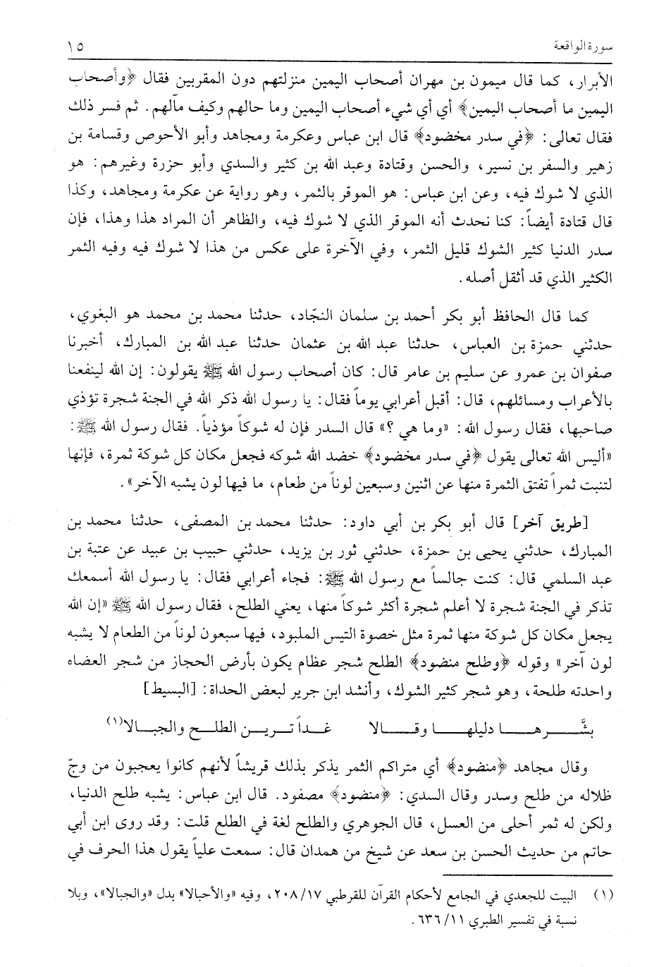 وَقَالَ مُجَاهِدٌ مَنْضُودٍ أَيْ مُتَرَاكِمُ الثَّمَرِ يُذَكِّرُ بِذَلِكَ قُرَيْشًا لِأَنَّهُمْ كَانُوا يَعْجَبُونَ مِنْ وَجٍّ ظلاله من طلح وسدر وقال السدي: مَنْضُودٍ مصفود. قَالَ ابْنُ عَبَّاسٍ: يُشْبِهُ طَلْحَ الدُّنْيَا، وَلَكِنْ لَهُ ثَمَرٌ أَحْلَى مِنَ الْعَسَلِ، قَالَ الْجَوْهَرِيُّ وَالطَّلْحُ لُغَةٌ فِي الطَّلْعِ قُلْتُ: وَقَدْ رَوَى ابْنُ أَبِي حَاتِمٍ مِنْ حَدِيثِ الْحَسَنِ بْنِ سَعْدٍ عَنْ شَيْخٍ مِنْ هَمْدَانَ قَالَ: سَمِعْتُ عليا يقول هذا الحرف في