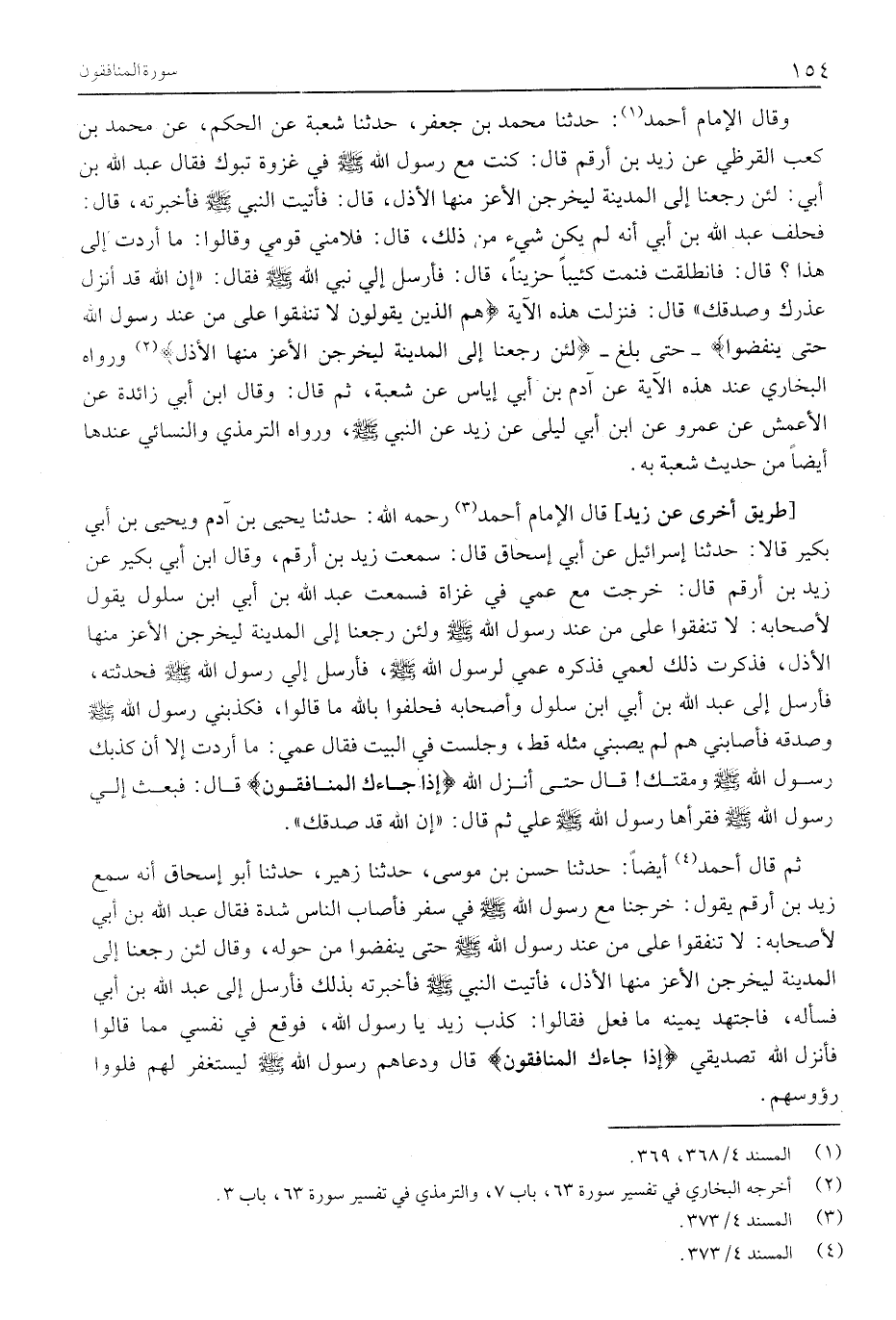 ثُمَّ قَالَ أَحْمَدُ «4» أَيْضًا: حَدَّثَنَا حَسَنُ بْنُ مُوسَى، حَدَّثَنَا زُهَيْرُ، حَدَّثَنَا أَبُو إِسْحَاقَ أَنَّهُ سَمِعَ زَيْدَ بْنَ أَرْقَمَ يَقُولُ: خَرَجْنَا مَعَ رَسُولِ اللَّهِ صَلَّى اللَّهُ عَلَيْهِ وَسَلَّمَ في سَفَرٍ فَأَصَابَ النَّاسَ شِدَّةٌ فَقَالَ عَبْدُ اللَّهِ بْنُ أُبَيٍّ لِأَصْحَابِهِ: لَا تُنْفِقُوا عَلَى مِنْ عِنْدِ رَسُولِ اللَّهِ صَلَّى اللَّهُ عَلَيْهِ وَسَلَّمَ حَتَّى يَنْفَضُّوا مِنْ حَوْلِهِ، وَقَالَ لَئِنْ رَجَعْنَا إِلَى الْمَدِينَةِ لَيُخْرِجَنَّ الْأَعَزُّ مِنْهَا الْأَذَلَّ، فَأَتَيْتُ النَّبِيَّ صَلَّى اللَّهُ عَلَيْهِ وَسَلَّمَ فَأَخْبَرْتُهُ بِذَلِكَ فَأَرْسَلَ إِلَى عَبْدِ اللَّهِ بْنِ أُبَيٍّ فَسَأَلَهُ، فَاجْتَهَدَ يَمِينَهُ مَا فَعَلَ فَقَالُوا: كَذَبَ زَيْدٌ يا رسول الله، فوقع في نفسي مما قالوا فأنزل اللَّهُ تَصْدِيقِي إِذا جاءَكَ الْمُنافِقُونَ قَالَ وَدَعَاهُمْ رَسُولِ اللَّهِ صَلَّى اللَّهُ عَلَيْهِ وَسَلَّمَ لِيَسْتَغْفِرَ لهم فلووا رؤوسهم.