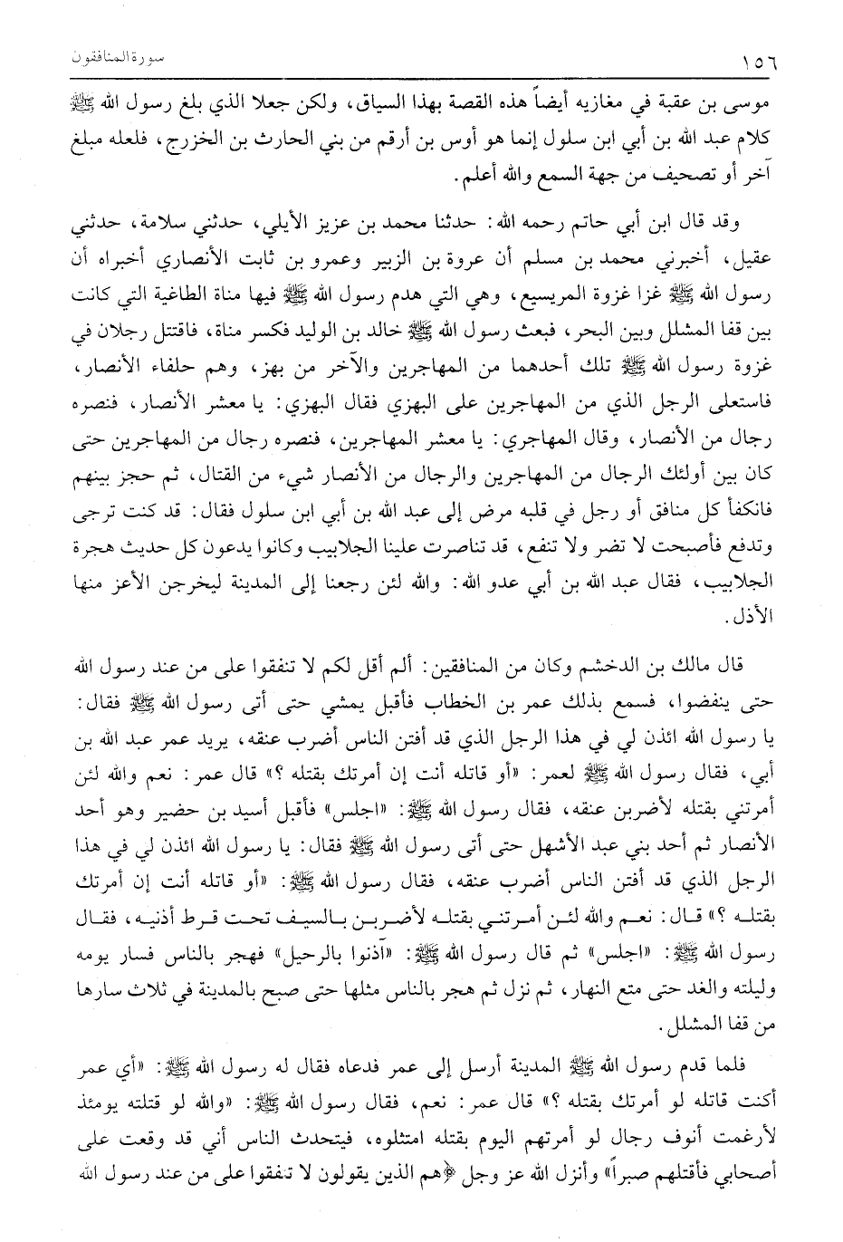 فَلَمَّا قَدِمَ رَسُولُ اللَّهِ صَلَّى اللَّهُ عَلَيْهِ وَسَلَّمَ الْمَدِينَةَ أَرْسَلَ إِلَى عُمَرَ فَدَعَاهُ فَقَالَ لَهُ رَسُولُ اللَّهِ صَلَّى اللَّهُ عَلَيْهِ وَسَلَّمَ: «أَيْ عُمَرُ أَكُنْتَ قَاتِلَهُ لَوْ أَمَرْتُكَ بِقَتْلِهِ؟» قَالَ عُمَرُ: نَعَمْ، فَقَالَ رَسُولُ اللَّهِ صَلَّى اللَّهُ عَلَيْهِ وَسَلَّمَ: «وَاللَّهِ لَوْ قَتَلْتَهُ يَوْمَئِذٍ لَأَرْغَمْتَ أُنُوفَ رِجَالٍ لَوْ أَمَرْتُهُمُ الْيَوْمَ بِقَتْلِهِ امْتَثَلُوهُ، فَيَتَحَدَّثُ النَّاسُ أَنِّي قَدْ وَقَعْتُ عَلَى أَصْحَابِي فَأَقْتُلُهُمْ صَبْرًا» وَأَنْزَلَ اللَّهُ عَزَّ وَجَلَّ هُمُ الَّذِينَ يَقُولُونَ لَا تُنْفِقُوا عَلى مَنْ عِنْدَ رَسُولِ اللَّهِ حَتَّى يَنْفَضُّوا
