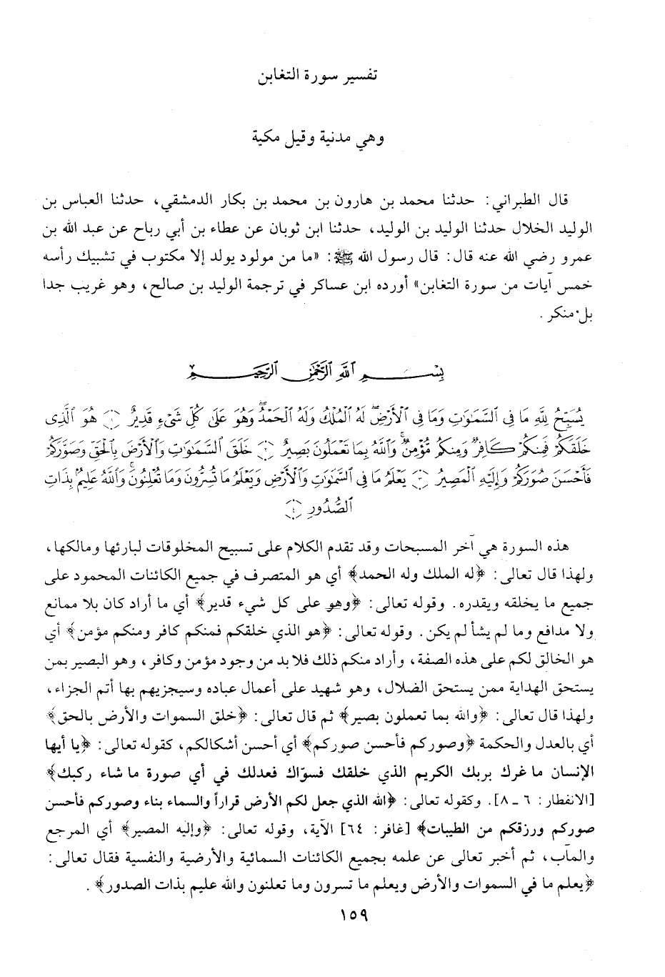وَهِيَ مَدَنِيَّةٌ وَقِيلَ مَكِّيَّةٌ قَالَ الطَّبَرَانِيُّ: حَدَّثَنَا مُحَمَّدُ بْنُ هَارُونَ بْنِ مُحَمَّدِ بْنِ بَكَّارٍ الدِّمَشْقِيُّ، حَدَّثَنَا الْعَبَّاسُ بْنُ الْوَلِيدِ الْخَلَّالُ حَدَّثَنَا الْوَلِيدُ بْنُ الْوَلِيدِ، حَدَّثَنَا ابْنُ ثَوْبَانَ عَنْ عَطَاءِ بْنِ أَبِي رَبَاحٍ عَنْ عَبْدِ اللَّهِ بْنِ عَمْرٍو رَضِيَ اللَّهُ عَنْهُ قَالَ: قَالَ رَسُولُ اللَّهِ صَلَّى اللَّهُ عَلَيْهِ وَسَلَّمَ: «مَا مِنْ مَوْلُودٍ يُولَدُ إِلَّا مَكْتُوبٌ فِي تَشْبِيكِ رَأْسِهِ خَمْسُ آيَاتٍ مِنْ سُورَةِ التَّغَابُنِ» أَوْرَدَهُ ابْنُ عَسَاكِرَ فِي تَرْجَمَةِ الْوَلِيدِ بْنِ صَالِحٍ، وَهُوَ غَرِيبٌ جِدًّا بَلْ منكر.