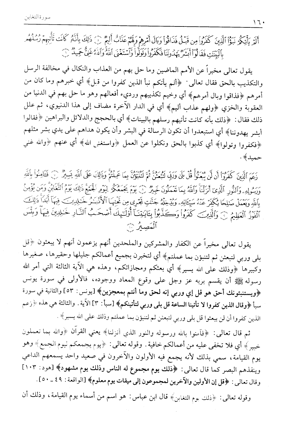 زَعَمَ الَّذِينَ كَفَرُوا أَنْ لَنْ يُبْعَثُوا قُلْ بَلى وَرَبِّي لَتُبْعَثُنَّ ثُمَّ لَتُنَبَّؤُنَّ بِما عَمِلْتُمْ وَذلِكَ عَلَى اللَّهِ يَسِيرٌ (7) فَآمِنُوا بِاللَّهِ وَرَسُولِهِ وَالنُّورِ الَّذِي أَنْزَلْنا وَاللَّهُ بِما تَعْمَلُونَ خَبِيرٌ (8) يَوْمَ يَجْمَعُكُمْ لِيَوْمِ الْجَمْعِ ذلِكَ يَوْمُ التَّغابُنِ وَمَنْ يُؤْمِنْ بِاللَّهِ وَيَعْمَلْ صالِحاً يُكَفِّرْ عَنْهُ سَيِّئاتِهِ وَيُدْخِلْهُ جَنَّاتٍ تَجْرِي مِنْ تَحْتِهَا الْأَنْهارُ خالِدِينَ فِيها أَبَداً ذلِكَ الْفَوْزُ الْعَظِيمُ (9) وَالَّذِينَ كَفَرُوا وَكَذَّبُوا بِآياتِنا أُولئِكَ أَصْحابُ النَّارِ خالِدِينَ فِيها وَبِئْسَ الْمَصِيرُ (10)