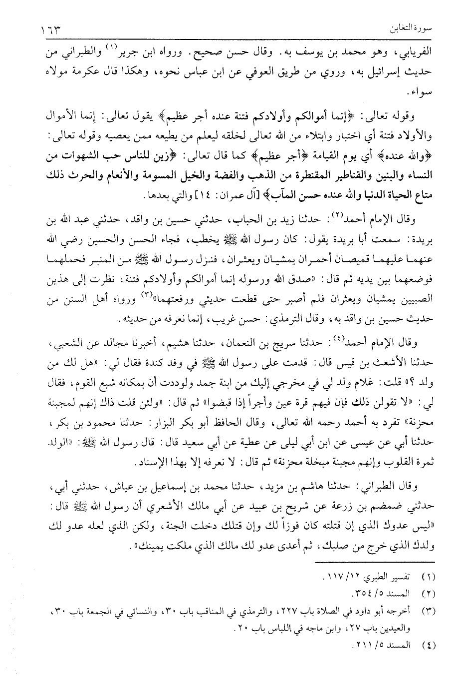 وَقَالَ الْإِمَامُ أَحْمَدُ «2» : حَدَّثَنَا زَيْدُ بْنُ الْحُبَابِ، حَدَّثَنِي حُسَيْنُ بْنُ وَاقَدٍ، حَدَّثَنِي عَبْدُ اللَّهِ بْنُ بريدة: سمعت أبا بُرَيْدَةَ يَقُولُ: كَانَ رَسُولُ اللَّهِ صَلَّى اللَّهُ عَلَيْهِ وَسَلَّمَ يَخْطُبُ، فَجَاءَ الْحَسَنُ وَالْحُسَيْنُ رَضِيَ اللَّهُ عَنْهُمَا عَلَيْهِمَا قَمِيصَانِ أَحْمَرَانِ يَمْشِيَانِ وَيَعْثُرَانِ، فَنَزَلَ رَسُولُ اللَّهِ صَلَّى اللَّهُ عَلَيْهِ وَسَلَّمَ مِنَ الْمِنْبَرِ فَحَمَلَهُمَا فَوَضَعَهُمَا بَيْنَ يَدَيْهِ ثُمَّ قَالَ: «صَدَقَ اللَّهُ وَرَسُولُهُ إِنَّمَا أَمْوَالُكُمْ وَأَوْلَادُكُمْ فِتْنَةٌ، نَظَرْتُ إِلَى هَذَيْنِ الصَّبِيَّيْنِ يَمْشِيَانِ وَيَعْثُرَانِ فَلَمْ أَصْبِرْ حَتَّى قَطَعْتُ حَدِيثِي وَرَفَعْتُهُمَا» «3» وَرَوَاهُ أَهْلُ السُّنَنِ مِنْ حَدِيثِ حُسَيْنِ بْنِ وَاقِدٍ بِهِ، وَقَالَ التِّرْمِذِيُّ: حَسَنٌ غَرِيبٌ، إِنَّمَا نَعْرِفُهُ مِنْ حَدِيثِهِ.
