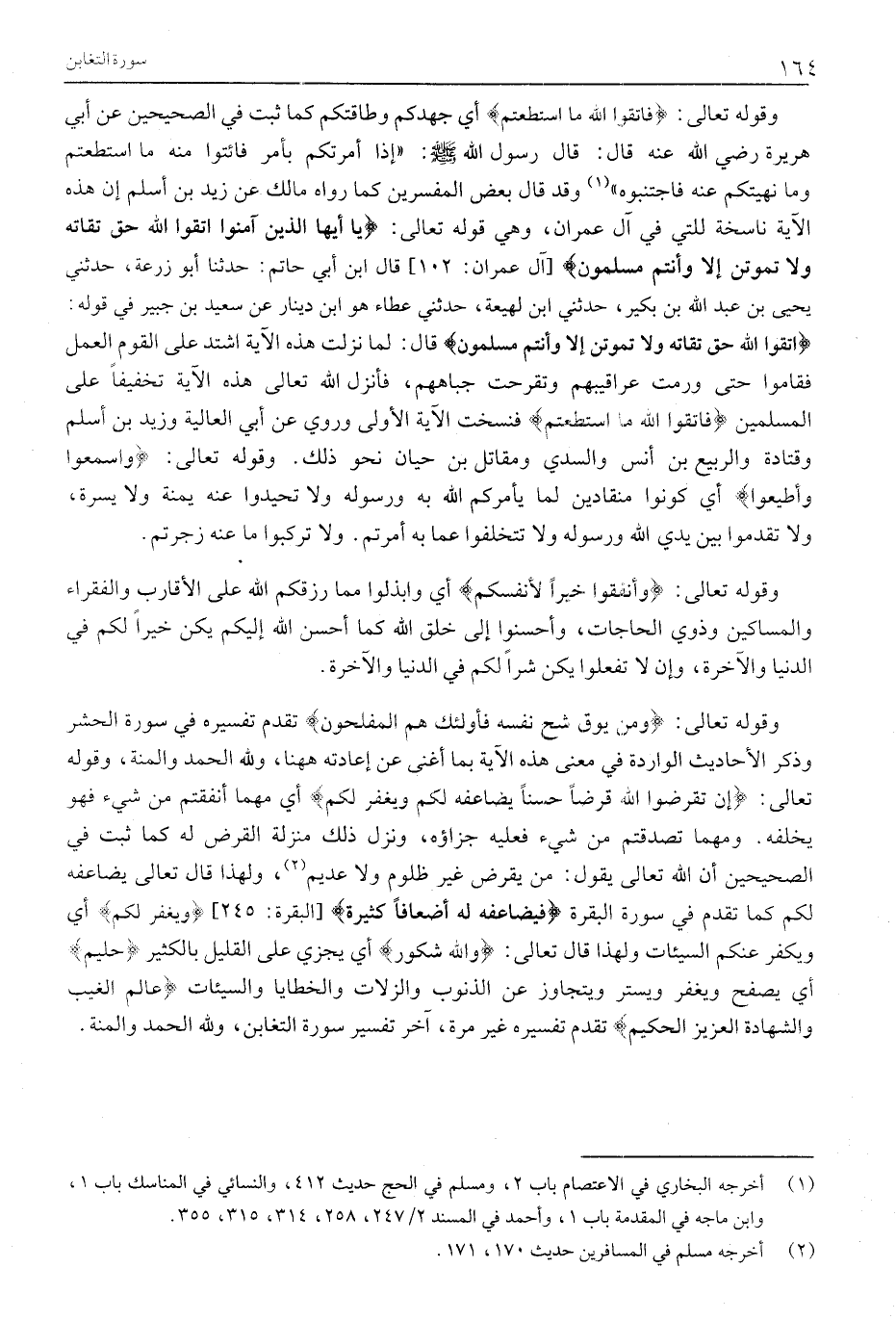 وَقَوْلُهُ تَعَالَى: فَاتَّقُوا اللَّهَ مَا اسْتَطَعْتُمْ أَيْ جُهْدَكُمْ وَطَاقَتَكُمْ كَمَا ثَبَتَ فِي الصَّحِيحَيْنِ عَنْ أَبِي هُرَيْرَةَ رَضِيَ اللَّهُ عَنْهُ قَالَ: قَالَ رَسُولُ اللَّهِ صَلَّى الله عليه وسلم: «إذا أَمَرْتُكُمْ بِأَمْرٍ فَائْتُوا مِنْهُ مَا اسْتَطَعْتُمْ وَمَا نَهَيْتُكُمْ عَنْهُ فَاجْتَنِبُوهُ» «1» وَقَدْ قَالَ بَعْضُ الْمُفَسِّرِينَ كَمَا رَوَاهُ مَالِكٌ عَنْ زَيْدِ بْنِ أَسْلَمَ إن هذه الآية نَاسِخَةٌ لِلَّتِي فِي آلِ عِمْرَانَ، وَهِيَ قَوْلُهُ تَعَالَى: يَا أَيُّهَا الَّذِينَ آمَنُوا اتَّقُوا اللَّهَ حَقَّ تُقاتِهِ وَلا تَمُوتُنَّ إِلَّا وَأَنْتُمْ مُسْلِمُونَ [آلِ عِمْرَانَ: 102] قَالَ ابْنُ أَبِي حَاتِمٍ: حَدَّثَنَا أَبُو زُرْعَةَ، حَدَّثَنِي يَحْيَى بْنُ عَبْدِ اللَّهِ بْنِ بُكَيْرٍ، حَدَّثَنِي ابن لهيعة، حدثني عطاء هُوَ ابْنُ دِينَارٍ عَنْ سَعِيدِ بْنِ جُبَيْرٍ فِي قَوْلِهِ: