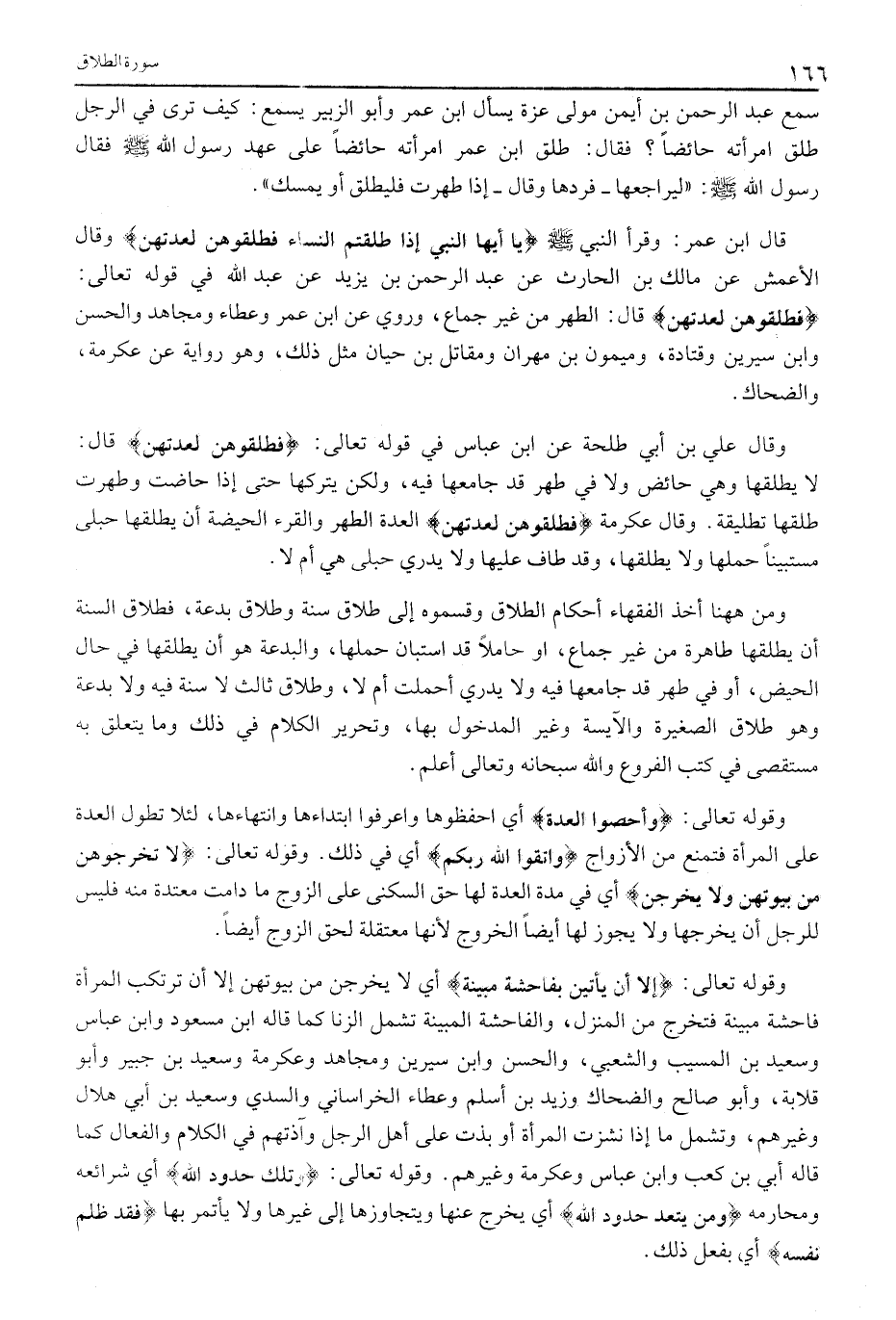 لَا يُطَلِّقْهَا وَهِيَ حَائِضٌ وَلَا في طهر قد جامعها فيه، ولكن يتركها حَتَّى إِذَا حَاضَتْ وَطَهُرَتْ طَلِّقْهَا تَطْلِيقَةً. وَقَالَ عِكْرِمَةُ فَطَلِّقُوهُنَّ لِعِدَّتِهِنَّ الْعِدَّةُ الطُّهْرُ وَالْقُرْءُ الْحَيْضَةُ أَنْ يُطَلِّقَهَا حُبْلَى مُسْتَبِينًا حَمْلَهَا وَلَا يُطَلِّقَهَا، وَقَدْ طَافَ عَلَيْهَا وَلَا يَدْرِي حُبْلَى هِيَ أم لا.