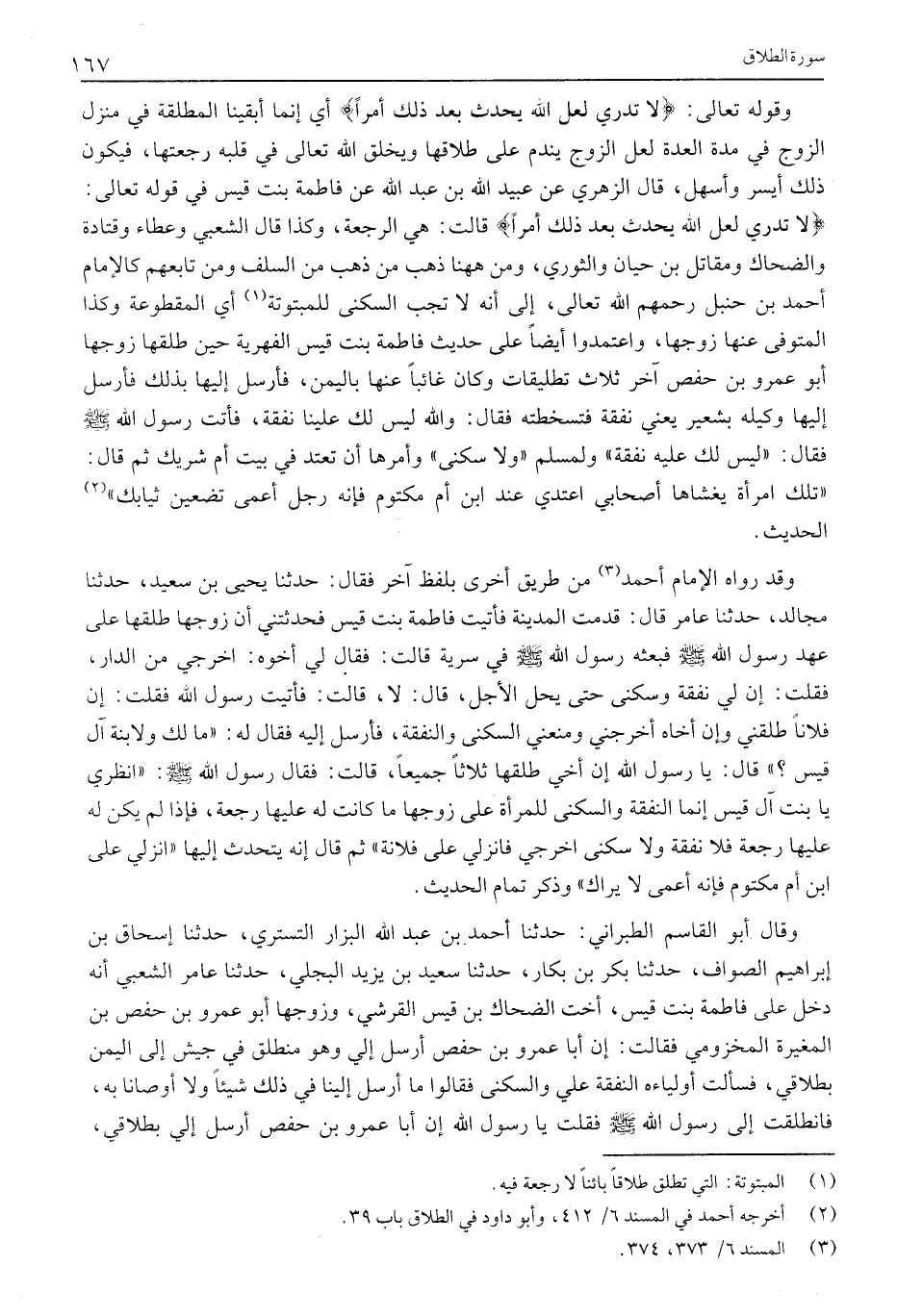 لَا تَدْرِي لَعَلَّ اللَّهَ يُحْدِثُ بَعْدَ ذلِكَ أَمْراً قالت: هِيَ الرَّجْعَةُ، وَكَذَا قَالَ الشَّعْبِيُّ وَعَطَاءٌ وقَتَادَةُ والضحاك ومقاتل بن حيان والثوري، ومن هاهنا ذَهَبَ مَنْ ذَهَبَ مِنَ السَّلَفِ وَمَنْ تَابَعَهُمْ كالإمام أحمد بن حنبل رحمهم اللَّهُ تَعَالَى، إِلَى أَنَّهُ لَا تَجِبُ السُّكْنَى للمبتوتة «1» أي المقطوعة وَكَذَا الْمُتَوَفَّى عَنْهَا زَوْجُهَا، وَاعْتَمَدُوا أَيْضًا عَلَى حَدِيثِ فَاطِمَةَ بِنْتِ قَيْسٍ الْفِهْرِيَّةِ حِينَ طَلَّقَهَا زَوْجُهَا أَبُو عَمْرُو بْنُ حَفْصٍ آخِرَ ثَلَاثِ تَطْلِيقَاتٍ وَكَانَ غَائِبًا عَنْهَا بِالْيَمَنِ، فَأَرْسَلَ إِلَيْهَا بِذَلِكَ فَأَرْسَلَ إِلَيْهَا وَكِيلَهُ بِشَعِيرٍ يَعْنِي نَفَقَةً فَتَسَخَّطَتْهُ فَقَالَ: وَاللَّهِ لَيْسَ لَكِ عَلَيْنَا نَفَقَةٌ، فَأَتَتْ رَسُولَ اللَّهِ صَلَّى اللَّهُ عَلَيْهِ وَسَلَّمَ فَقَالَ: «لَيْسَ لَكِ عَلَيْهِ نَفَقَةٌ» وَلِمُسْلِمٍ «وَلَا سُكْنَى» وَأَمَرَهَا أَنْ تَعْتَدَّ فِي بَيْتِ أُمِّ شَرِيكٍ ثُمَّ قَالَ:
