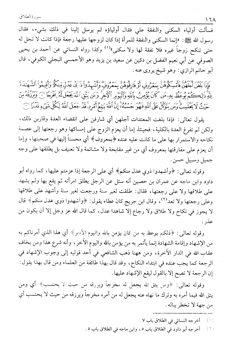 فَإِذا بَلَغْنَ أَجَلَهُنَّ فَأَمْسِكُوهُنَّ بِمَعْرُوفٍ أَوْ فارِقُوهُنَّ بِمَعْرُوفٍ وَأَشْهِدُوا ذَوَيْ عَدْلٍ مِنْكُمْ وَأَقِيمُوا الشَّهادَةَ لِلَّهِ ذلِكُمْ يُوعَظُ بِهِ مَنْ كانَ يُؤْمِنُ بِاللَّهِ وَالْيَوْمِ الْآخِرِ وَمَنْ يَتَّقِ اللَّهَ يَجْعَلْ لَهُ مَخْرَجاً (2) وَيَرْزُقْهُ مِنْ حَيْثُ لَا يَحْتَسِبُ وَمَنْ يَتَوَكَّلْ عَلَى اللَّهِ فَهُوَ حَسْبُهُ إِنَّ اللَّهَ بالِغُ أَمْرِهِ قَدْ جَعَلَ اللَّهُ لِكُلِّ شَيْءٍ قَدْراً (3)