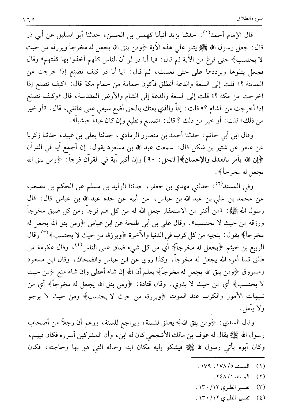 قال الإمام أحمد «1» : حدثنا يزيد أنبأنا كَهَمْسُ بْنُ الْحَسَنِ، حَدَّثَنَا أَبُو السَّلِيلِ عَنْ أَبِي ذَرٍّ قَالَ: جَعَلَ رَسُولُ اللَّهِ صَلَّى اللَّهُ عَلَيْهِ وَسَلَّمَ يَتْلُو عَلَيَّ هَذِهِ الْآيَةَ وَمَنْ يَتَّقِ اللَّهَ يَجْعَلْ لَهُ مَخْرَجاً وَيَرْزُقْهُ مِنْ حَيْثُ لَا يَحْتَسِبُ حَتَّى فَرَغَ مِنَ الْآيَةِ ثُمَّ قَالَ: «يَا أَبَا ذَرٍّ لَوْ أَنَّ النَّاسَ كُلَّهُمْ أَخَذُوا بِهَا كَفَتْهُمْ» وَقَالَ فَجَعَلَ يَتْلُوهَا وَيُرَدِّدُهَا عَلَيَّ حَتَّى نَعَسْتُ، ثُمَّ قال: «يا أبا ذر كيف تصنع إذا خرجت مِنَ الْمَدِينَةِ؟» قُلْتُ إِلَى السَّعَةِ وَالدَّعَةِ أَنْطَلِقُ فَأَكُونُ حَمَامَةً مِنْ حَمَامِ مَكَّةَ قَالَ: «كَيْفَ تصنع إذا أخرجت من مكة؟» قلت: إلى السعة والدعة إلى الشام والأرض المقدسة، قال «وكيف تصنع إذا أُخْرِجْتَ مِنَ الشَّامِ؟» قُلْتُ: إِذًا وَالَّذِي بَعَثَكَ بالحق أضع سيفي على عاتقي، قال: «أو خير من ذلك» قلت: أو خير مِنْ ذَلِكَ؟ قَالَ: «تَسْمَعُ وَتُطِيعُ وَإِنْ كَانَ عَبْدًا حَبَشِيًّا» .