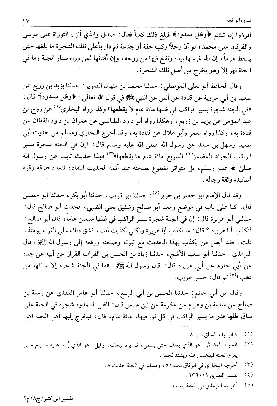 «فِي الْجَنَّةِ شَجَرَةٌ يَسِيرُ الرَّاكِبُ فِي ظِلِّهَا مِائَةَ عَامٍ لَا يَقْطَعُهَا» وَكَذَا رَوَاهُ الْبُخَارِيُّ «1» عَنْ رَوْحِ بْنِ عَبْدِ الْمُؤْمِنِ عَنْ يَزِيدَ بْنِ زُرَيْعٍ، وَهَكَذَا رَوَاهُ أَبُو دَاوُدَ الطَّيَالِسِيُّ عن عمران بن داود الْقَطَّانِ عَنْ قَتَادَةَ بِهِ، وَكَذَا رَوَاهُ مَعْمَرٌ وَأَبُو هِلَالٍ عَنْ قَتَادَةَ بِهِ، وَقَدْ أَخْرَجَ الْبُخَارِيُّ وَمُسْلِمٌ مِنْ حَدِيثِ أَبِي سَعِيدٍ وَسَهْلِ بْنِ سَعْدٍ عَنْ رَسُولِ اللَّهِ صَلَّى اللَّهُ عَلَيْهِ وَسَلَّمَ قَالَ: «إِنَّ فِي الْجَنَّةِ شَجَرَةً يَسِيرُ الرَّاكِبُ الْجَوَادَ الْمُضْمَرَ «2» السَّرِيعَ مِائَةَ عَامٍ مَا يَقْطَعُهَا» «3» فَهَذَا حَدِيثٌ ثَابِتٌ عَنْ رَسُولِ اللَّهِ صَلَّى اللَّهُ عَلَيْهِ وَسَلَّمَ، بَلْ مُتَوَاتِرٌ مَقْطُوعٌ بِصِحَّتِهِ عِنْدَ أَئِمَّةِ الْحَدِيثِ النُّقَّادِ، لِتَعَدُّدِ طُرُقِهِ وَقُوَّةِ أَسَانِيدِهِ وَثِقَةِ رِجَالِهِ.