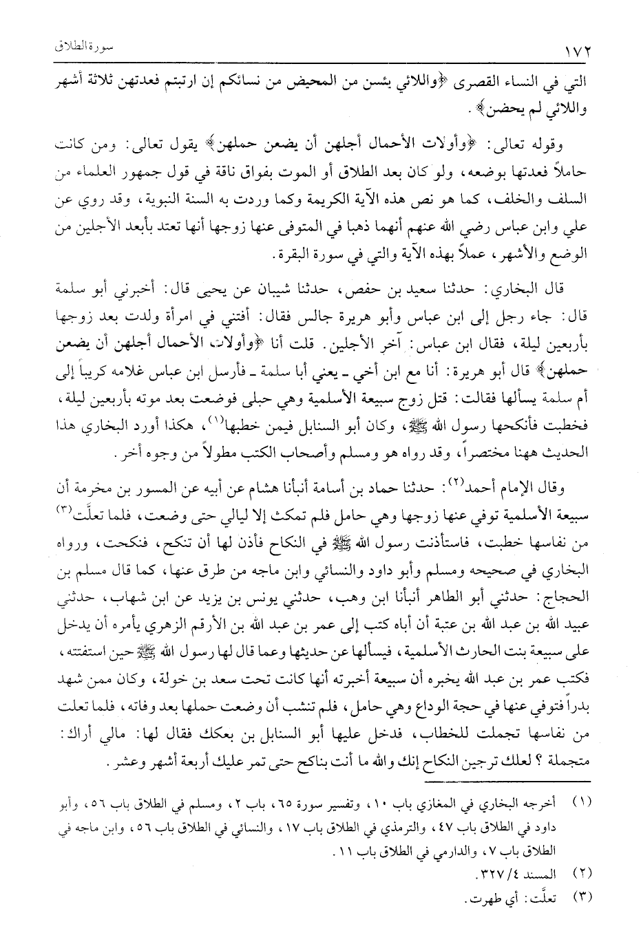 وَقَالَ الْإِمَامُ أَحْمَدُ «2» : حَدَّثَنَا حَمَّادُ بْنُ أُسَامَةَ أنبأنا هِشَامٌ عَنْ أَبِيهِ عَنِ الْمِسْوَرِ بْنِ مَخْرَمَةَ أَنَّ سُبَيْعَةَ الْأَسْلَمِيَّةَ تُوُفِّيَ عَنْهَا زَوْجُهَا وَهِيَ حَامِلٌ فَلَمْ تَمْكُثْ إِلَّا لَيَالِيَ حَتَّى وَضَعَتْ، فَلَمَّا تَعَلَّتْ «3» مِنْ نِفَاسِهَا خُطِبَتْ، فَاسْتَأْذَنْتُ رَسُولَ اللَّهِ صَلَّى اللَّهُ عَلَيْهِ وَسَلَّمَ فِي النِّكَاحِ فَأَذِنَ لَهَا أَنْ تُنْكَحَ، فَنُكِحَتْ، وَرَوَاهُ الْبُخَارِيُّ فِي صَحِيحِهِ وَمُسْلِمٌ وَأَبُو دَاوُدَ وَالنَّسَائِيُّ وَابْنُ مَاجَهْ مِنْ طُرُقٍ عَنْهَا، كَمَا قَالَ مُسْلِمُ بن الحجاج: حدثني أبو الطاهر أنبأنا ابْنُ وَهْبٍ، حَدَّثَنِي يُونُسُ بْنُ يَزِيدَ عَنِ ابْنُ شِهَابٍ، حَدَّثَنِي عُبَيْدِ اللَّهِ بْنِ عَبْدِ اللَّهِ بْنِ عُتْبَةَ أَنَّ أَبَاهُ كَتَبَ إِلَى عُمَرَ بْنِ عَبْدِ اللَّهِ بْنِ الْأَرْقَمِ الزُّهْرِيِّ يَأْمُرُهُ أَنْ يَدْخُلَ عَلَى سُبَيْعَةَ بِنْتِ الْحَارِثِ الْأَسْلَمِيَّةِ، فَيَسْأَلَهَا عَنْ حَدِيثِهَا وَعَمَّا قَالَ لَهَا رَسُولُ اللَّهِ صَلَّى اللَّهُ عَلَيْهِ وَسَلَّمَ حين اسْتَفْتَتْهُ، فَكَتَبَ عُمَرُ بْنُ عَبْدِ اللَّهِ يُخْبِرُهُ أَنَّ سُبَيْعَةَ أَخْبَرَتْهُ أَنَّهَا كَانَتْ تَحْتَ سَعْدِ بْنِ خَوْلَةَ، وَكَانَ مِمَّنْ شَهِدَ بَدْرًا فَتُوُفِّيَ عَنْهَا فِي حَجَّةِ الْوَدَاعِ وَهِيَ حَامِلٌ، فَلَمْ تَنْشَبْ أَنْ وَضَعَتْ حَمْلَهَا بَعْدَ وَفَاتِهِ، فَلَمَّا تَعَلَّتْ مِنْ نِفَاسِهَا تَجَمَّلَتْ لِلْخُطَّابِ، فَدَخَلَ عَلَيْهَا أَبُو السَّنَابِلِ بْنُ بَعْكَكٍ فَقَالَ لَهَا: مَالِي أَرَاكِ: