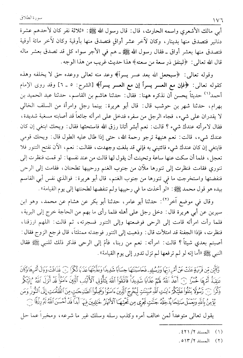 وقوله تعالى: سَيَجْعَلُ اللَّهُ بَعْدَ عُسْرٍ يُسْراً وَعْدٌ مِنْهُ تَعَالَى وَوَعْدُهُ حَقٌّ لَا يُخْلِفُهُ وَهَذِهِ كَقَوْلِهِ تَعَالَى: فَإِنَّ مَعَ الْعُسْرِ يُسْراً إِنَّ مَعَ الْعُسْرِ يُسْراً [الشَّرْحِ: 5- 6] وَقَدْ رَوَى الْإِمَامُ أَحْمَدُ «1» حديثا يحسن أن نذكره هاهنا: فَقَالَ: حَدَّثَنَا هَاشِمُ بْنُ الْقَاسِمِ، حَدَّثَنَا عَبْدُ الْحَمِيدِ بْنُ بِهْرَامٍ، حَدَّثَنَا شَهْرُ بْنُ حَوْشَبٍ قَالَ: قَالَ أَبُو هُرَيْرَةَ: بَيْنَمَا رَجُلٌ وَامْرَأَةٌ من السَّلَفِ الْخَالِي لَا يَقْدِرَانِ عَلَى شَيْءٍ، فَجَاءَ الرَّجُلُ مِنْ سَفَرِهِ فَدَخَلَ عَلَى امْرَأَتِهِ جَائِعًا قد أصابته مَسْغَبَةً شَدِيدَةً، فَقَالَ لِامْرَأَتِهِ عِنْدَكِ شَيْءٌ؟ قَالَتْ: نعم أبشر أتانا رِزْقُ اللَّهِ فَاسْتَحَثَّهَا فَقَالَ: وَيْحَكِ ابْتَغِي إِنْ كَانَ عِنْدَكِ شَيْءٌ، قَالَتْ: نَعَمْ هُنَيْهَةً تَرْجُو رحمة الله، حتى إذا طال عليه الطول قَالَ: وَيْحَكِ قُومِي فَابْتَغِي إِنْ كَانَ عِنْدَكِ شَيْءٌ فَائْتِينِي بِهِ فَإِنِّي قَدْ بُلِغْتُ وَجَهِدْتُ، فقالت: نعم، الآن نفتح التَّنُّورُ فَلَا تَعْجَلْ، فَلَمَّا أَنْ سَكَتَ عَنْهَا سَاعَةً وَتَحَيَّنَتْ أَنْ يَقُولَ لَهَا قَالَتْ مِنْ عِنْدِ نَفْسِهَا: لَوْ قُمْتُ فَنَظَرْتُ إِلَى تَنُّورِي فَقَامَتْ فَنَظَرَتْ إِلَى تَنُّورِهَا مَلْآنَ مِنْ جُنُوبِ الْغَنَمِ وَرَحْيَيْهَا تَطْحَنَانِ، فَقَامَتْ إِلَى الرَّحَى فَنَفَضَتْهَا وَاسْتَخْرَجَتْ مَا فِي تَنُّورِهَا مِنْ جُنُوبِ الْغَنَمِ، قال أبو هريرة: فو الذي نَفْسُ أَبِي الْقَاسِمِ بِيَدِهِ هُوَ قَوْلُ مُحَمَّدٍ صَلَّى اللَّهُ عَلَيْهِ وَسَلَّمَ: «لَوْ أَخَذَتْ مَا في رحييها ولم تنفضها لطحنتها إِلَى يَوْمِ الْقِيَامَةِ» .
