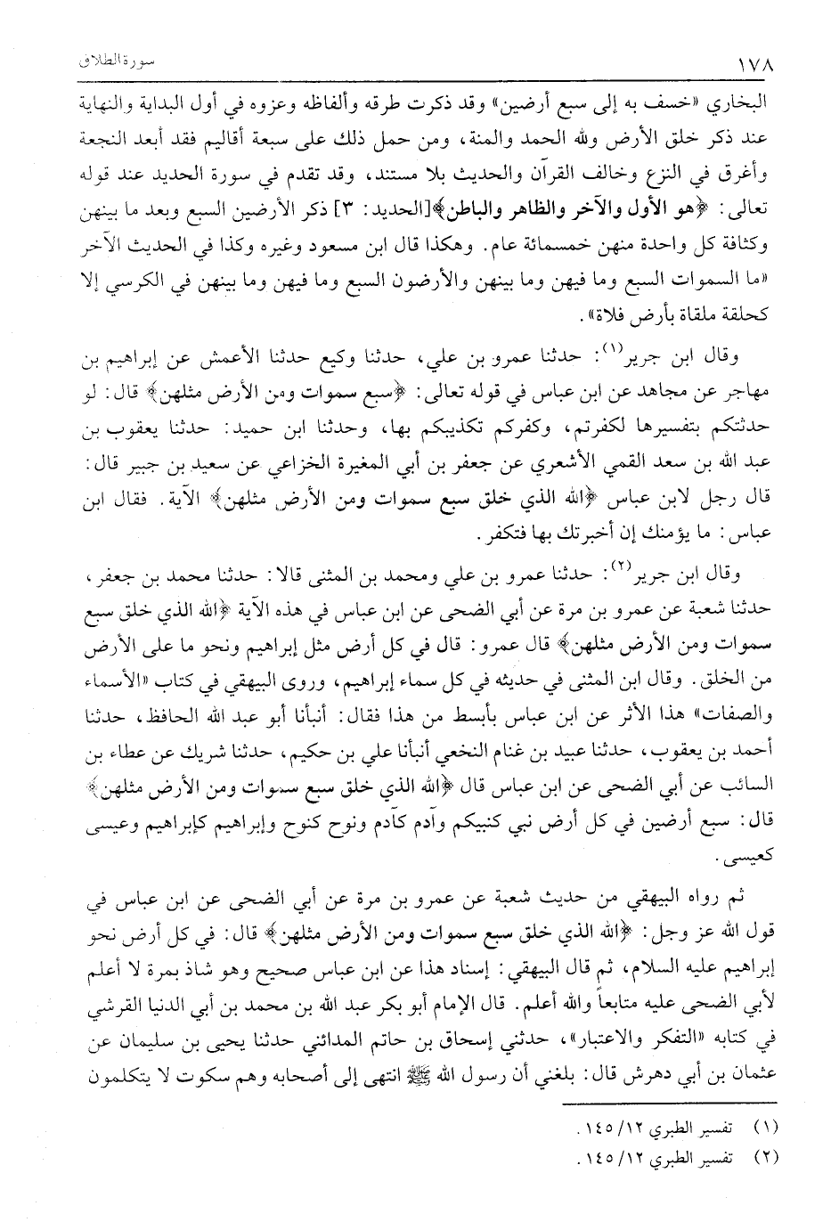 وَقَالَ ابْنُ جَرِيرٍ «2» : حَدَّثَنَا عَمْرُو بْنُ عَلِيٍّ وَمُحَمَّدُ بْنُ الْمُثَنَّى قَالَا: حَدَّثَنَا مُحَمَّدُ بْنُ جَعْفَرٍ، حَدَّثَنَا شُعْبَةُ عَنْ عَمْرِو بْنِ مُرَّةَ عَنْ أَبِي الضُّحَى عَنْ ابْنِ عَبَّاسٍ فِي هَذِهِ الْآيَةِ اللَّهُ الَّذِي خَلَقَ سَبْعَ سَماواتٍ وَمِنَ الْأَرْضِ مِثْلَهُنَّ قَالَ عَمْرٌو: قَالَ فِي كُلِّ أَرْضٍ مِثْلُ إِبْرَاهِيمَ وَنَحْوُ مَا عَلَى الْأَرْضِ مِنَ الْخَلْقِ. وَقَالَ ابْنُ الْمُثَنَّى فِي حَدِيثِهِ فِي كُلِّ سَمَاءٍ إِبْرَاهِيمُ، وروى الْبَيْهَقِيُّ فِي كِتَابِ «الْأَسْمَاءِ وَالصِّفَاتِ» هَذَا الْأَثَرَ عن ابن عباس بأبسط من هذا فقال: أنبأنا أَبُو عَبْدِ اللَّهِ الْحَافِظُ، حَدَّثَنَا أَحْمَدُ بْنُ يعقوب، حدثنا عبيد بن غنام النخعي أنبأنا عَلِيُّ بْنُ حَكِيمٍ، حَدَّثَنَا شَرِيكٍ عَنْ عَطَاءِ بْنِ السَّائِبِ عَنْ أَبِي الضُّحَى عَنِ ابْنِ عَبَّاسٍ قَالَ اللَّهُ الَّذِي خَلَقَ سَبْعَ سَماواتٍ وَمِنَ الْأَرْضِ مِثْلَهُنَّ قَالَ: سَبْعُ أَرَضِينَ فِي كُلِّ أَرْضٍ نَبِيٌّ كَنَبِيِّكُمْ وَآدَمُ كَآدَمَ وَنُوحٌ كَنُوحٍ وَإِبْرَاهِيمُ كَإِبْرَاهِيمَ وَعِيسَى كَعِيسَى.