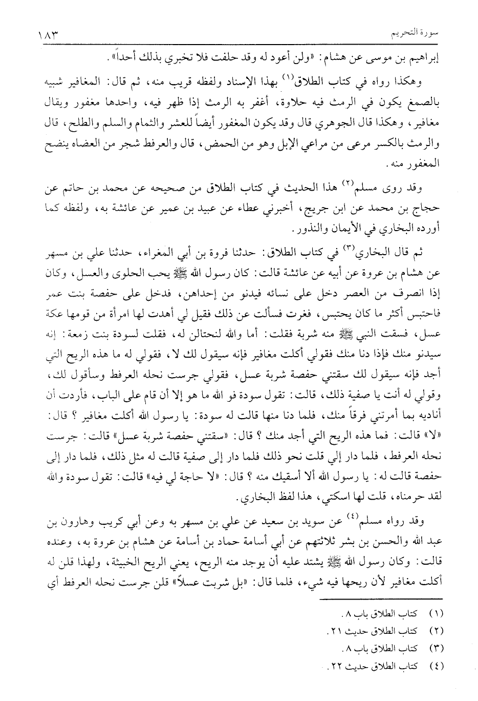 ثُمَّ قَالَ الْبُخَارِيُّ «3» فِي كِتَابِ الطَّلَاقِ: حَدَّثَنَا فَرْوَةُ بْنُ أَبِي الْمَغْرَاءِ، حَدَّثَنَا عَلِيُّ بْنُ مُسْهِرٍ عَنْ هِشَامِ بْنِ عُرْوَةَ عَنْ أَبِيهِ عَنْ عَائِشَةَ قَالَتْ: كَانَ رَسُولُ اللَّهِ صَلَّى اللَّهُ عَلَيْهِ وَسَلَّمَ يُحِبُّ الْحَلْوَى وَالْعَسَلَ، وَكَانَ إِذَا انْصَرَفَ مِنَ الْعَصْرِ دَخَلَ عَلَى نِسَائِهِ فَيَدْنُو مِنْ إِحْدَاهُنَّ، فَدَخَلَ عَلَى حَفْصَةَ بِنْتِ عُمَرَ فَاحْتَبَسَ أَكْثَرَ مَا كَانَ يَحْتَبِسُ، فَغِرْتُ فَسَأَلْتُ عَنْ ذَلِكَ فَقِيلَ لِي أَهْدَتْ لَهَا امْرَأَةٌ مِنْ قَوْمِهَا عُكَّةَ عَسَلٍ، فَسَقَتِ النَّبِيَّ صَلَّى اللَّهُ عَلَيْهِ وَسَلَّمَ مِنْهُ شَرْبَةً فَقُلْتُ: أَمَا وَاللَّهِ لَنَحْتَالَنَّ لَهُ، فَقُلْتُ لِسَوْدَةَ بِنْتِ زَمْعَةَ: إِنَّهُ سَيَدْنُو مِنْكِ فَإِذَا دَنَا مِنْكِ فَقُولِي أَكَلْتَ مَغَافِيرَ فَإِنَّهُ سيقول لك لَا، فَقُولِي لَهُ مَا هَذِهِ الرِّيحُ الَّتِي أَجِدُ فَإِنَّهُ سَيَقُولُ لَكِ سَقَتْنِي حَفْصَةُ شَرْبَةَ عسل، فقولي جرست نحله العرفط وسأقول لك، وقولي له أنت يا صفية ذلك، قالت: تقول سودة فو الله مَا هُوَ إِلَّا أَنْ قَامَ عَلَى الْبَابِ، فَأَرَدْتُ أَنْ أُنَادِيَهُ بِمَا أَمَرْتِنِي فَرَقًا مِنْكِ، فَلَمَّا دَنَا مِنْهَا قَالَتْ لَهُ سَوْدَةُ: يَا رَسُولَ اللَّهِ أَكَلْتَ مَغَافِيرَ؟ قَالَ: