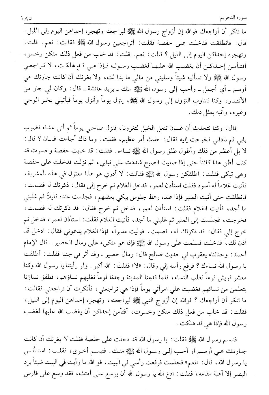 وَتَهْجُرُهُ إِحْدَاكُنَّ الْيَوْمَ إِلَى اللَّيْلِ؟ قَالَتْ: نَعَمْ. قُلْتُ: قَدْ خَابَ مَنْ فَعَلَ ذَلِكَ مِنْكُنَّ وَخَسِرَ، أَفَتَأْمَنُ إِحْدَاكُنَّ أَنْ يَغْضَبَ اللَّهُ عَلَيْهَا لِغَضَبِ رَسُولِهِ فَإِذَا هِيَ قَدْ هَلَكَتْ، لَا تُرَاجِعِي رَسُولِ اللَّهِ صَلَّى اللَّهُ عَلَيْهِ وَسَلَّمَ وَلَا تَسْأَلِيهِ شَيْئًا وَسَلِينِي مِنْ مَالِي مَا بَدَا لَكِ، وَلَا يَغُرَّنَّكِ إِنْ كانت جارتك هي أوسم- أي أجمل- وَأَحَبُّ إِلَى رَسُولِ اللَّهِ صَلَّى اللَّهُ عَلَيْهِ وَسَلَّمَ مِنْكِ- يُرِيدُ عَائِشَةَ- قَالَ: وَكَانَ لِي جَارٌ مِنَ الْأَنْصَارِ، وَكُنَّا نَتَنَاوَبُ النُّزُولَ إِلَى رَسُولِ اللَّهِ صَلَّى اللَّهُ عَلَيْهِ وَسَلَّمَ، يَنْزِلُ يَوْمًا وَأَنْزِلُ يَوْمًا فَيَأْتِينِي بِخَبَرِ الْوَحْيِ وَغَيْرِهِ، وَآتِيهِ بِمِثْلِ ذَلِكَ.