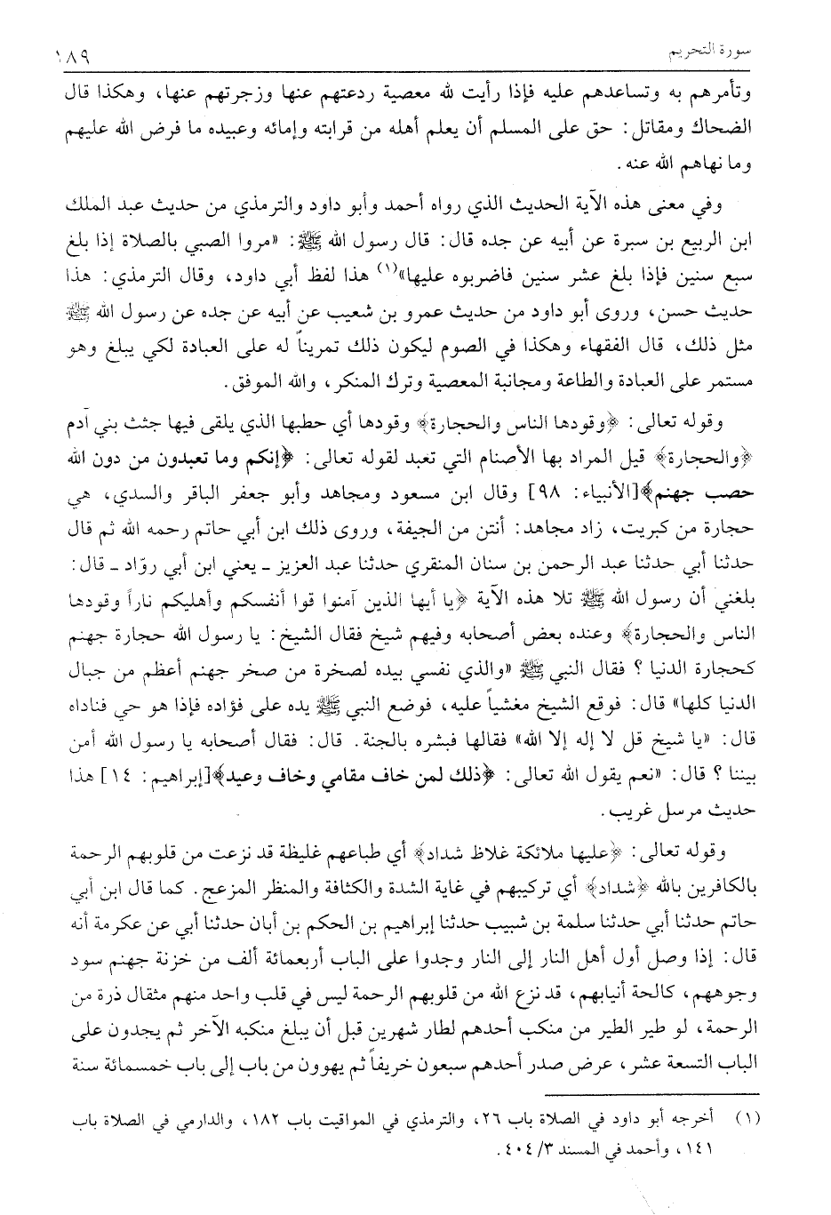 وَفِي مَعْنَى هَذِهِ الآية الحديث الذي رواه أَحْمَدُ وَأَبُو دَاوُدَ وَالتِّرْمِذِيُّ مِنْ حَدِيثِ عَبْدِ الملك ابن الرَّبِيعِ بْنِ سَبْرَةَ عَنْ أَبِيهِ عَنْ جَدِّهِ قَالَ: قَالَ رَسُولُ اللَّهِ صَلَّى اللَّهُ عَلَيْهِ وَسَلَّمَ: «مُرُوا الصَّبِيَّ بِالصَّلَاةِ إِذَا بَلَغَ سَبْعَ سِنِينَ فَإِذَا بَلَغَ عَشْرَ سِنِينَ فَاضْرِبُوهُ عَلَيْهَا» «1» هَذَا لَفْظُ أَبِي دَاوُدَ، وَقَالَ التِّرْمِذِيُّ: هَذَا حَدِيثٌ حَسَنٌ، وَرَوَى أَبُو دَاوُدَ مِنْ حَدِيثُ عَمْرِو بْنِ شُعَيْبٍ عَنْ أَبِيهِ عَنْ جَدِّهِ عَنْ رَسُولِ اللَّهِ صَلَّى اللَّهُ عَلَيْهِ وَسَلَّمَ مِثْلَ ذَلِكَ، قَالَ الْفُقَهَاءُ وَهَكَذَا فِي الصَّوْمِ لِيَكُونَ ذَلِكَ تَمْرِينًا لَهُ عَلَى الْعِبَادَةِ لِكَيْ يَبْلُغَ وَهُوَ مُسْتَمِرٌّ عَلَى الْعِبَادَةِ وَالطَّاعَةِ وَمُجَانَبَةِ المعصية وترك المنكر، والله الموفق.