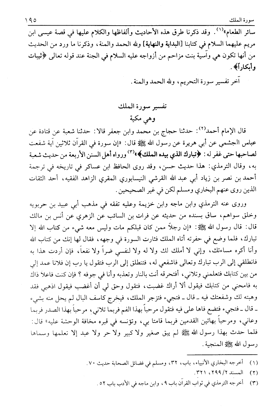 وهي مكية قَالَ الْإِمَامُ أَحْمَدُ «2» : حَدَّثَنَا حَجَّاجُ بْنُ مُحَمَّدٍ وَابْنُ جَعْفَرٍ قَالَا: حَدَّثَنَا شُعْبَةُ عَنْ قَتَادَةَ عَنْ عَبَّاسٍ الْجُشَمِيِّ عَنْ أَبِي هُرَيْرَةَ عَنْ رَسُولِ اللَّهِ صَلَّى اللَّهُ عَلَيْهِ وَسَلَّمَ قَالَ: «إِنَّ سُورَةً فِي الْقُرْآنِ ثَلَاثِينَ آيَةً شَفَعَتْ لِصَاحِبِهَا حَتَّى غُفِرَ لَهُ: تَبارَكَ الَّذِي بِيَدِهِ الْمُلْكُ»