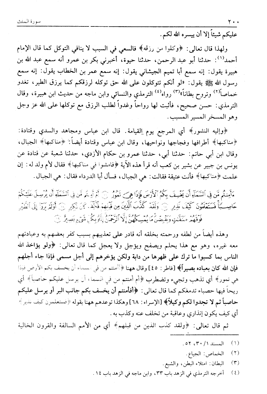 ولهذا قال تعالى: وَكُلُوا مِنْ رِزْقِهِ فَالسَّعْيُ فِي السَّبَبِ لَا يُنَافِي التَّوَكُّلَ كَمَا قَالَ الْإِمَامُ أَحْمَدُ «1» : حَدَّثَنَا أَبُو عَبْدِ الرَّحْمَنِ، حَدَّثَنَا حَيْوَةُ، أَخْبَرَنِي بَكْرُ بْنُ عَمْرٍو أَنَّهُ سَمِعَ عَبْدَ اللَّهِ بْنَ هُبَيْرَةَ يَقُولُ: إِنَّهُ سَمِعَ أَبَا تَمِيمٍ الْجَيْشَانِيَّ يَقُولُ: إِنَّهُ سَمِعَ عُمَرَ بْنَ الْخَطَّابِ يَقُولُ: أَنَّهُ سَمِعَ رَسُولَ اللَّهِ صَلَّى اللَّهُ عَلَيْهِ وَسَلَّمَ يَقُولُ: «لَوْ أَنَّكُمْ تَتَوَكَّلُونَ عَلَى اللَّهِ حَقَّ تَوَكُّلِهِ لَرَزَقَكُمْ كَمَا يَرْزُقُ الطَّيْرَ، تَغْدُو خِمَاصًا «2» وَتَرُوحُ بِطَانًا» «3» رَوَاهُ «4» التِّرْمِذِيُّ وَالنَّسَائِيُّ وَابْنُ مَاجَهْ مِنْ حَدِيثِ ابْنِ هُبَيْرَةَ، وَقَالَ التِّرْمِذِيُّ: حَسَنٌ صَحِيحٌ، فَأَثْبَتَ لَهَا رَوَاحًا وَغُدُوًّا لِطَلَبِ الرِّزْقِ مَعَ تَوَكُّلِهَا عَلَى اللَّهِ عَزَّ وَجَلَّ وَهُوَ الْمُسَخِّرُ الْمُسَيِّرُ الْمُسَبِّبُ.