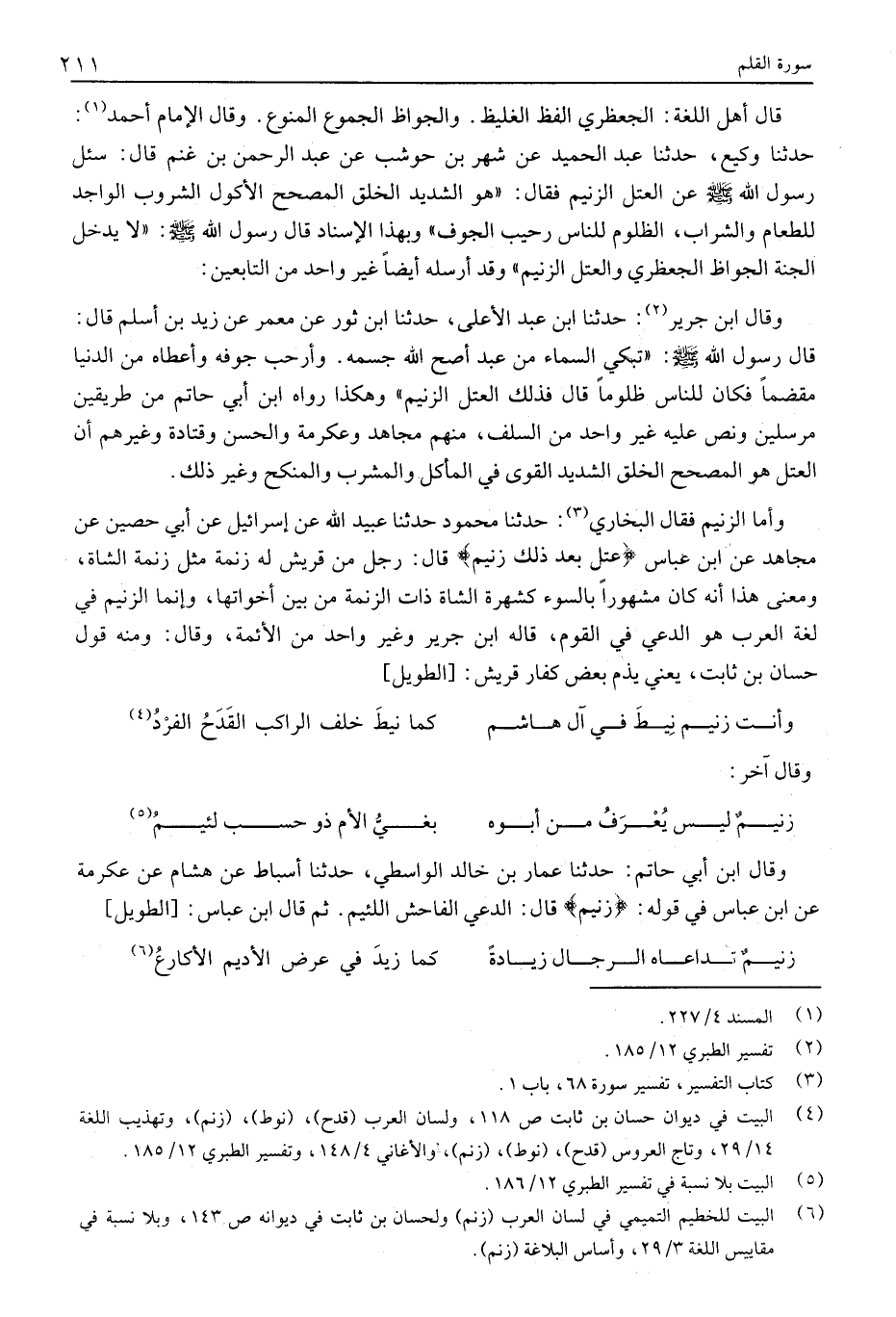 وَأَمَّا الزَّنِيمُ فَقَالَ الْبُخَارِيُّ «3» : حَدَّثَنَا مَحْمُودٌ حَدَّثَنَا عُبَيْدُ اللَّهِ عَنْ إِسْرَائِيلَ عَنْ أَبِي حُصَيْنٍ عَنْ مُجَاهِدٍ عَنِ ابْنِ عَبَّاسٍ عُتُلٍّ بَعْدَ ذلِكَ زَنِيمٍ قَالَ: رَجُلٌ مِنْ قُرَيْشٍ لَهُ زَنَمَةٌ مِثْلُ زَنَمَةِ الشَّاةِ، وَمَعْنَى هَذَا أنه كان مشهورا بالسوء كَشُهْرَةِ الشَّاةِ ذَاتِ الزَّنَمَةِ مِنْ بَيْنِ أَخَوَاتِهَا، وَإِنَّمَا الزَّنِيمُ فِي لُغَةِ الْعَرَبِ هُوَ الدَّعِيُّ فِي الْقَوْمِ، قَالَهُ ابْنُ جَرِيرٍ وَغَيْرُ وَاحِدٍ من الأئمة، وقال: وَمِنْهُ قَوْلُ حَسَّانَ بْنِ ثَابِتٍ، يَعْنِي يَذُمُّ بعض كفار قريش: [الطويل]