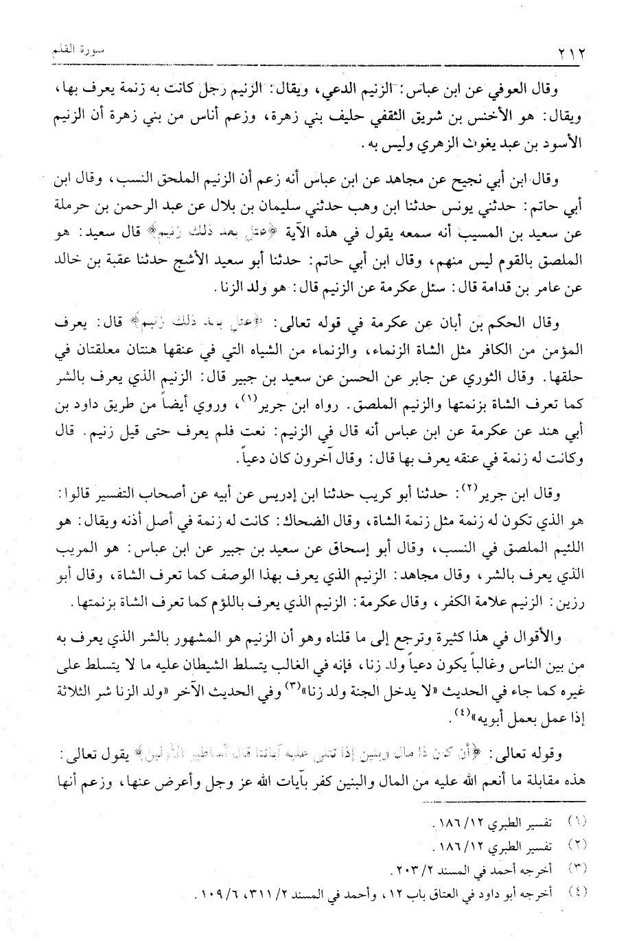 وَقَالَ ابْنِ أَبِي نَجِيحٍ عَنْ مُجَاهِدٍ عَنِ ابْنِ عَبَّاسٍ أَنَّهُ زَعَمَ أَنَّ الزَّنِيمَ الْمُلْحَقُ النَّسَبِ، وَقَالَ ابْنُ أَبِي حَاتِمٍ: حَدَّثَنِي يُونُسُ حَدَّثَنَا ابْنُ وَهْبٍ حَدَّثَنِي سُلَيْمَانُ بْنُ بِلَالٍ عَنْ عَبْدِ الرَّحْمَنِ بْنِ حَرْمَلَةَ عَنْ سَعِيدِ بْنِ الْمُسَيَّبِ أَنَّهُ سَمِعَهُ يَقُولُ فِي هَذِهِ الْآيَةِ عُتُلٍّ بَعْدَ ذلِكَ زَنِيمٍ قَالَ سَعِيدٌ: هُوَ الْمُلْصَقُ بِالْقَوْمِ لَيْسَ مِنْهُمْ، وَقَالَ ابْنُ أَبِي حَاتِمٍ: حَدَّثَنَا أَبُو سَعِيدٍ الْأَشَجُّ حَدَّثَنَا عُقْبَةُ بْنُ خَالِدٍ عَنْ عَامِرِ بْنِ قُدَامَةَ قَالَ: سُئِلَ عِكْرِمَةُ عَنِ الزَّنِيمِ قَالَ: هُوَ وَلَدُ الزِّنَا.