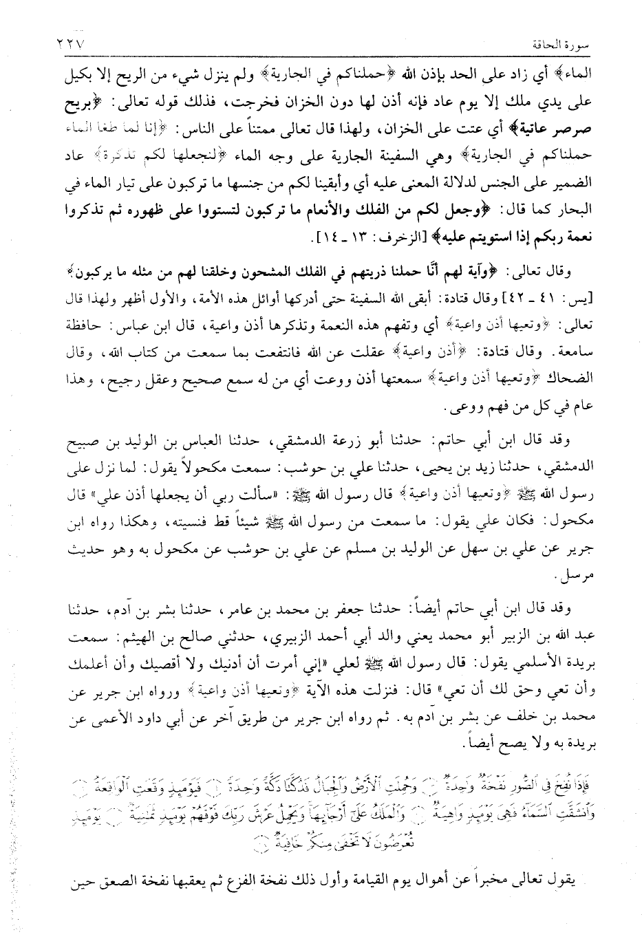 فَإِذا نُفِخَ فِي الصُّورِ نَفْخَةٌ واحِدَةٌ (13) وَحُمِلَتِ الْأَرْضُ وَالْجِبالُ فَدُكَّتا دَكَّةً واحِدَةً (14) فَيَوْمَئِذٍ وَقَعَتِ الْواقِعَةُ (15) وَانْشَقَّتِ السَّماءُ فَهِيَ يَوْمَئِذٍ واهِيَةٌ (16) وَالْمَلَكُ عَلى أَرْجائِها وَيَحْمِلُ عَرْشَ رَبِّكَ فَوْقَهُمْ يَوْمَئِذٍ ثَمانِيَةٌ (17)