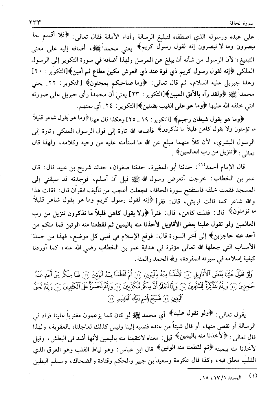 قَالَ الْإِمَامُ أَحْمَدُ «1» : حَدَّثَنَا أَبُو الْمُغِيرَةِ، حَدَّثَنَا صَفْوَانُ، حَدَّثَنَا شُرَيْحُ بْنُ عُبَيْدِ قَالَ: قَالَ عُمَرُ بْنُ الْخَطَّابِ: خَرَجْتُ أَتَعَرَّضُ رَسُولَ اللَّهِ صَلَّى اللَّهُ عَلَيْهِ وَسَلَّمَ قَبْلَ أَنْ أُسْلِمَ، فَوَجَدْتُهُ قَدْ سَبَقَنِي إِلَى الْمَسْجِدِ فَقُمْتُ خَلْفَهُ فَاسْتَفْتَحَ سُورَةَ الْحَاقَّةِ، فَجَعَلْتُ أَعْجَبُ مِنْ تَأْلِيفِ الْقُرْآنِ قَالَ: فَقُلْتُ هَذَا وَاللَّهِ شَاعِرٌ كَمَا قَالَتْ قُرَيْشٌ، قَالَ: فَقَرَأَ إِنَّهُ لَقَوْلُ رَسُولٍ كَرِيمٍ وَما هُوَ بِقَوْلِ شاعِرٍ قَلِيلًا مَا تُؤْمِنُونَ قَالَ: فَقُلْتُ كَاهِنٌ، قَالَ: فَقَرَأَ وَلا بِقَوْلِ كاهِنٍ قَلِيلًا مَا تَذَكَّرُونَ تَنْزِيلٌ مِنْ رَبِّ الْعالَمِينَ وَلَوْ تَقَوَّلَ عَلَيْنا بَعْضَ الْأَقاوِيلِ لَأَخَذْنا مِنْهُ بِالْيَمِينِ ثُمَّ لَقَطَعْنا مِنْهُ الْوَتِينَ فَما مِنْكُمْ مِنْ أَحَدٍ عَنْهُ حاجِزِينَ إِلَى آخِرِ السُّورَةِ قَالَ: فَوَقَعَ الْإِسْلَامُ في قلبي كل موضع، فَهَذَا مِنْ جُمْلَةِ الْأَسْبَابِ الَّتِي جَعَلَهَا اللَّهُ تَعَالَى مُؤَثِّرَةً فِي هِدَايَةِ عُمَرَ بْنِ الْخَطَّابِ رَضِيَ اللَّهُ عَنْهُ، كَمَا أَوْرَدْنَا كَيْفِيَّةَ إِسْلَامِهِ فِي سِيرَتِهِ الْمُفْرَدَةِ، ولله الحمد والمنة.