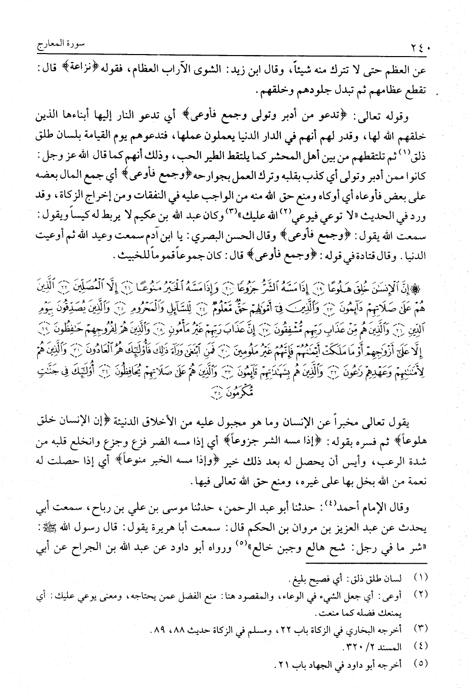 يَقُولُ تَعَالَى مُخْبِرًا عَنِ الْإِنْسَانِ وَمَا هُوَ مَجْبُولٌ عَلَيْهِ مِنَ الْأَخْلَاقِ الدَّنِيئَةِ إِنَّ الْإِنْسانَ خُلِقَ هَلُوعاً ثُمَّ فَسَّرَهُ بِقَوْلِهِ: إِذا مَسَّهُ الشَّرُّ جَزُوعاً أَيْ إِذَا مسه الضُّرُّ فَزِعَ وَجَزِعَ وَانْخَلَعَ قَلْبُهُ مِنْ شِدَّةِ الرُّعْبِ، وَأَيِسَ أَنْ يَحْصُلَ لَهُ بَعْدَ ذَلِكَ خَيْرٌ وَإِذا مَسَّهُ الْخَيْرُ مَنُوعاً أَيْ إِذَا حَصَلَتْ لَهُ نِعْمَةٌ مِنَ اللَّهِ بَخِلَ بِهَا على غيره، ومنع حق الله تعالى فِيهَا.