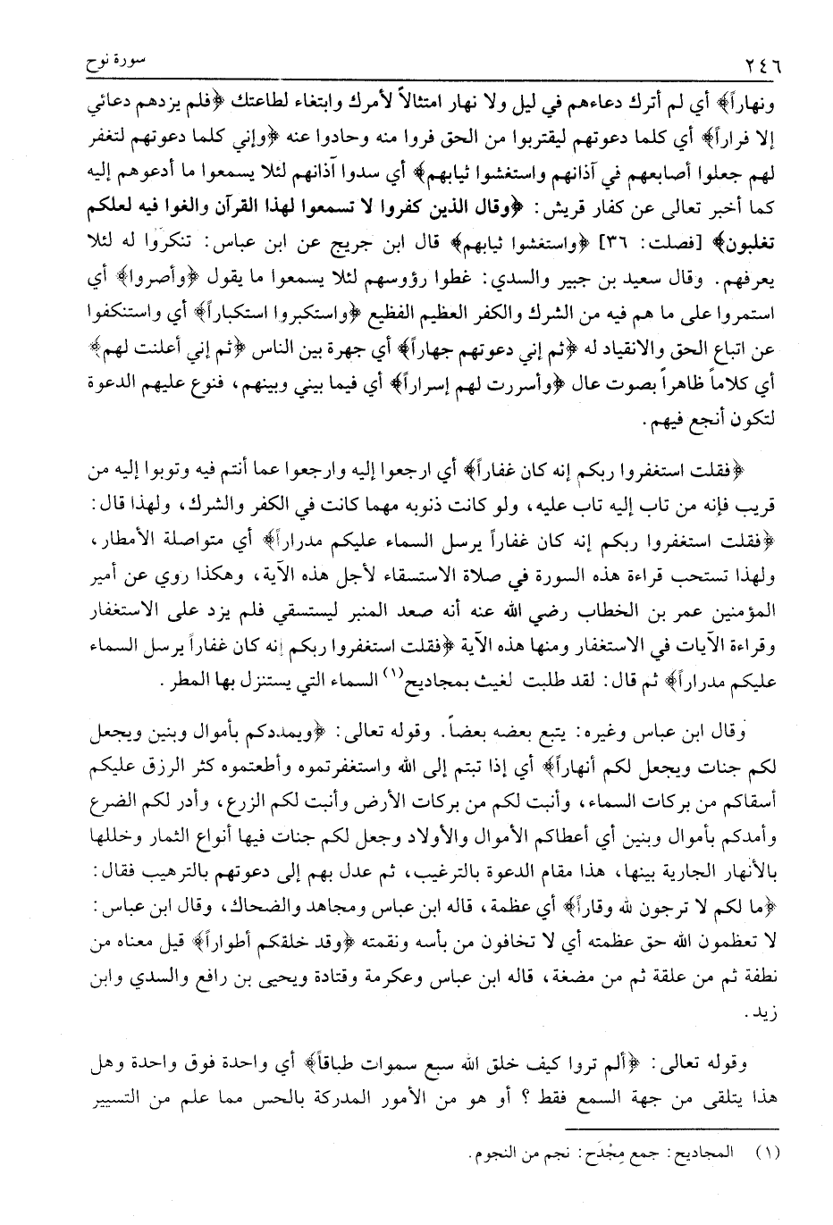 فَقُلْتُ اسْتَغْفِرُوا رَبَّكُمْ إِنَّهُ كانَ غَفَّاراً يُرْسِلِ السَّماءَ عَلَيْكُمْ مِدْراراً أَيْ مُتَوَاصِلَةَ الْأَمْطَارِ، وَلِهَذَا تُسْتَحَبُّ قِرَاءَةُ هَذِهِ السُّورَةِ فِي صَلَاةِ الِاسْتِسْقَاءِ لِأَجْلِ هَذِهِ الْآيَةِ، وَهَكَذَا رُوِيَ عَنْ أَمِيرِ الْمُؤْمِنِينَ عُمَرَ بْنِ الْخَطَّابِ رَضِيَ الله عنه أَنَّهُ صَعِدَ الْمِنْبَرَ لِيَسْتَسْقِيَ فَلَمْ يَزِدْ عَلَى الاستغفار وقراءة الْآيَاتِ فِي الِاسْتِغْفَارِ وَمِنْهَا هَذِهِ الْآيَةُ فَقُلْتُ اسْتَغْفِرُوا رَبَّكُمْ إِنَّهُ كانَ غَفَّاراً يُرْسِلِ السَّماءَ عَلَيْكُمْ مِدْراراً ثم قال: لقد طلبت لغيث بمجاديح «1» السماء التي يستنزل بِهَا الْمَطَرَ.