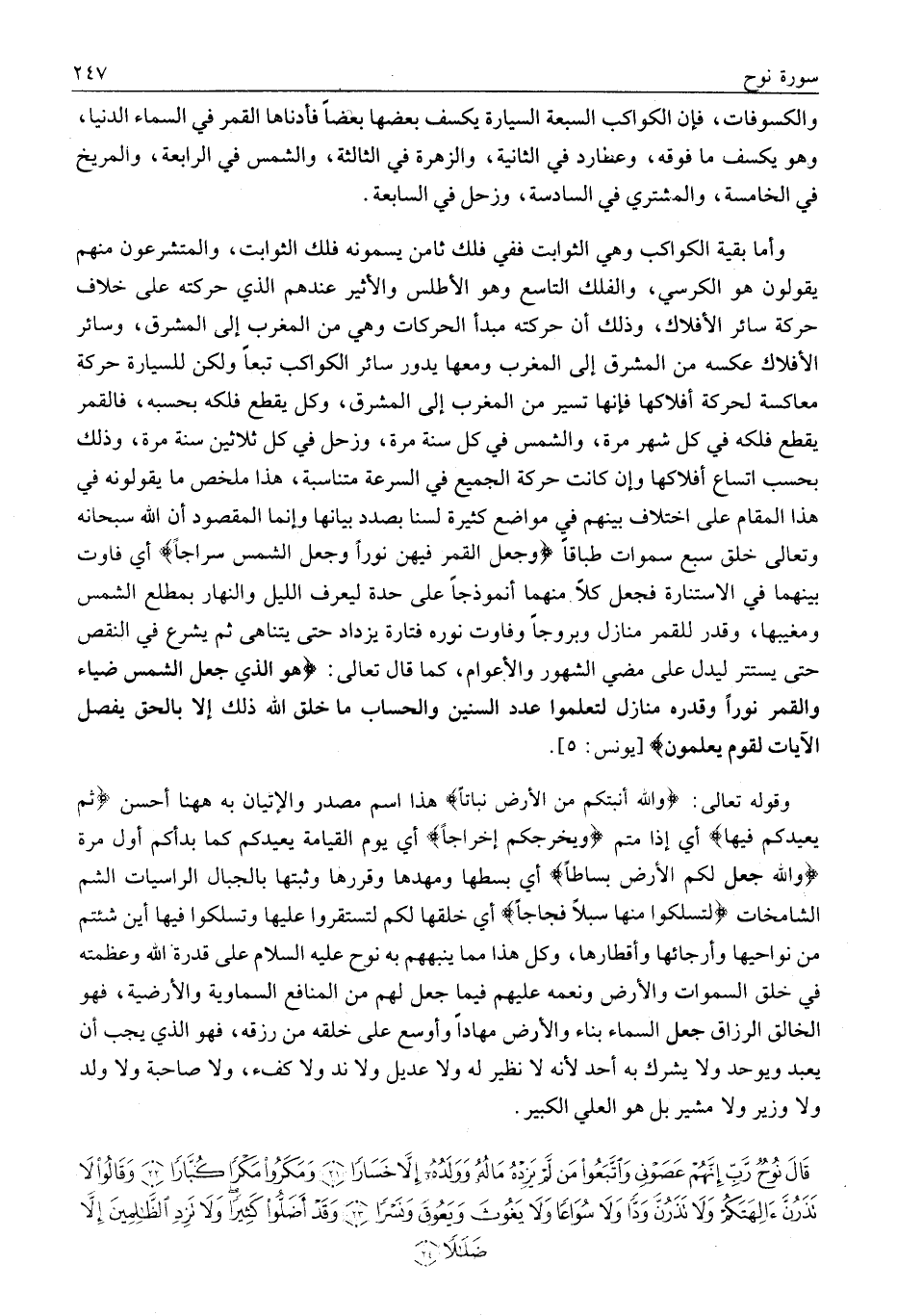 وَأَمَّا بَقِيَّةُ الْكَوَاكِبِ وَهِيَ الثَّوَابِتُ فَفِي فَلَكٍ ثَامِنٍ يُسَمُّونَهُ فَلَكَ الثَّوَابِتِ، وَالْمُتَشَرِّعُونَ مِنْهُمْ يَقُولُونَ هُوَ الْكُرْسِيُّ، وَالْفَلَكُ التَّاسِعُ وَهُوَ الْأَطْلَسُ وَالْأَثِيرُ عِنْدَهُمُ الَّذِي حَرَكَتُهُ عَلَى خِلَافِ حَرَكَةِ سَائِرِ الْأَفْلَاكِ، وَذَلِكَ أَنَّ حَرَكَتَهُ مَبْدَأُ الْحَرَكَاتِ وَهِيَ مِنَ الْمَغْرِبِ إِلَى الْمَشْرِقِ، وَسَائِرُ الْأَفْلَاكِ عَكْسُهُ مِنَ الْمَشْرِقِ إِلَى الْمَغْرِبِ وَمَعَهَا يَدُورُ سَائِرُ الْكَوَاكِبِ تَبَعًا وَلَكِنْ لِلسَّيَّارَةِ حَرَكَةٌ مُعَاكِسَةٌ لِحَرَكَةِ أَفْلَاكِهَا فَإِنَّهَا تَسِيرُ مِنَ الْمَغْرِبِ إِلَى الْمَشْرِقِ، وَكُّلٌ يَقْطَعُ فَلَكَهُ بِحَسْبِهِ، فَالْقَمَرُ يَقْطَعُ فَلَكَهُ فِي كُلِّ شَهْرٍ مَرَّةً، وَالشَّمْسُ فِي كُلِّ سَنَةٍ مَرَّةً، وَزُحَلُ فِي كُلِّ ثَلَاثِينَ سَنَةً مَرَّةً، وَذَلِكَ بِحَسْبِ اتِّسَاعِ أَفْلَاكِهَا وَإِنْ كَانَتْ حركة الجميع فِي السُّرْعَةِ مُتَنَاسِبَةً، هَذَا مُلَخَّصُ مَا يَقُولُونَهُ فِي هَذَا الْمَقَامِ عَلَى اخْتِلَافٍ بَيْنَهُمْ فِي مَوَاضِعَ كَثِيرَةٍ لَسْنَا بِصَدَدِ بَيَانِهَا وَإِنَّمَا الْمَقْصُودُ أن الله سبحانه وتعالى خلق سبع سموات طِبَاقًا وَجَعَلَ الْقَمَرَ فِيهِنَّ نُوراً وَجَعَلَ الشَّمْسَ سِراجاً أَيْ فَاوَتَ بَيْنَهُمَا فِي الِاسْتِنَارَةِ فَجَعَلَ كُلًّا مِنْهُمَا أُنْمُوذَجًا عَلَى حِدَةٍ لِيُعْرَفَ اللَّيْلُ والنهار بمطلع الشمس ومغيبها، وقدر للقمر مَنَازِلَ وَبُرُوجًا وَفَاوَتَ نُورَهُ فَتَارَةً يَزْدَادُ حَتَّى يتناهى ثم يشرع في النقص حتى يستتر لِيَدُلَّ عَلَى مُضِيِّ الشُّهُورِ وَالْأَعْوَامِ، كَمَا قَالَ تَعَالَى: هُوَ الَّذِي جَعَلَ الشَّمْسَ ضِياءً وَالْقَمَرَ نُوراً وَقَدَّرَهُ مَنازِلَ لِتَعْلَمُوا عَدَدَ السِّنِينَ وَالْحِسابَ مَا خَلَقَ اللَّهُ ذلِكَ إِلَّا بِالْحَقِّ يُفَصِّلُ الْآياتِ لِقَوْمٍ يَعْلَمُونَ [يونس: 5] .
