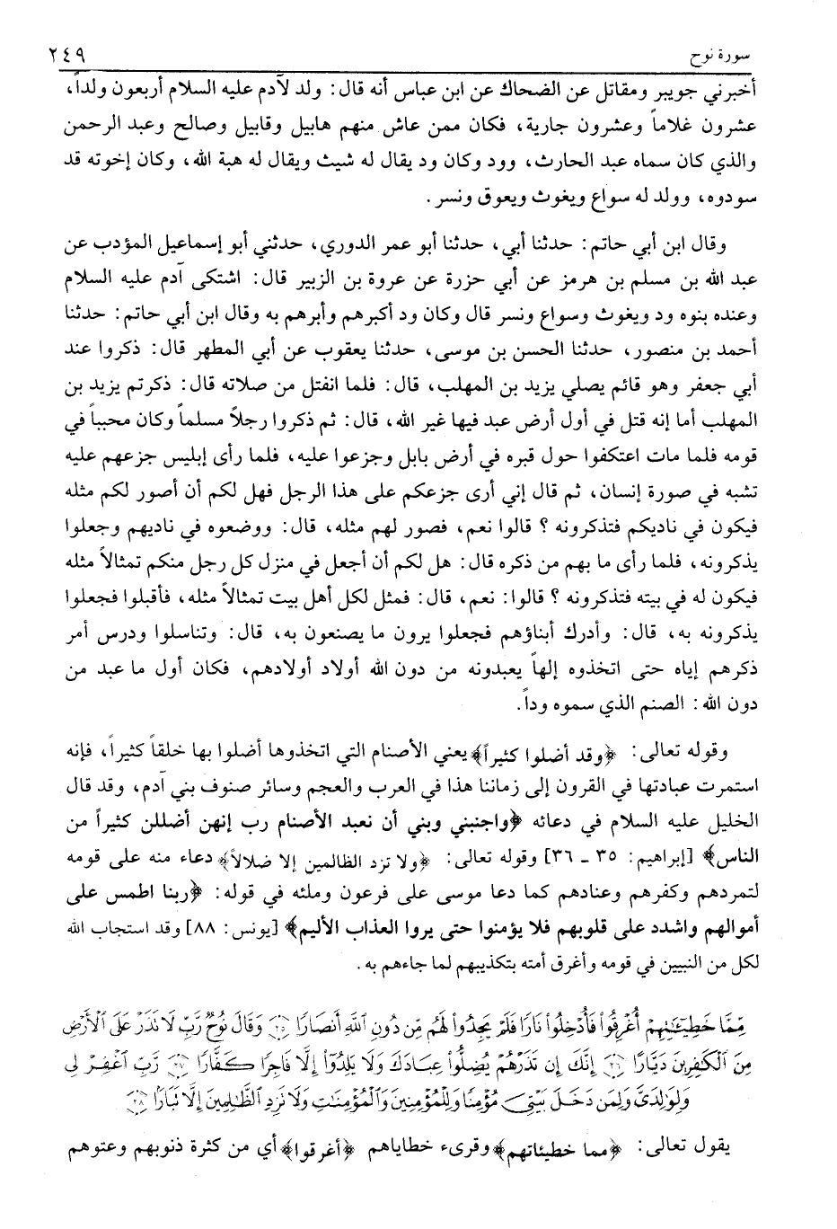 وَقَالَ ابْنُ أَبِي حَاتِمٍ: حَدَّثَنَا أَبِي، حَدَّثَنَا أَبُو عُمَرَ الدُّورِيُّ، حَدَّثَنِي أَبُو إِسْمَاعِيلَ الْمُؤَدَّبُ عَنْ عَبْدِ اللَّهِ بْنِ مُسْلِمِ بْنِ هُرْمُزَ عَنْ أَبِي حَزْرَةَ عَنْ عُرْوَةَ بْنِ الزُّبَيْرِ قَالَ: اشْتَكَى آدَمُ عليه السّلام وعنده بنوه ود ويغوث وَسُوَاعٌ وَنَسْرٌ قَالَ وَكَانَ وَدٌّ أَكْبَرَهُمْ وَأَبَرَّهُمْ بِهِ وَقَالَ ابْنُ أَبِي حَاتِمٍ: حَدَّثَنَا أَحْمَدُ بْنُ مَنْصُورٍ، حَدَّثَنَا الْحَسَنُ بْنُ مُوسَى، حَدَّثَنَا يَعْقُوبُ عَنْ أَبِي الْمُطَهِّرِ قَالَ: ذَكَرُوا عِنْدَ أَبِي جَعْفَرٍ وَهُوَ قَائِمٌ يُصَلِّي يَزِيدَ بْنَ الْمُهَلَّبِ، قَالَ: فَلَمَّا انْفَتَلَ مِنْ صِلَاتِهِ قَالَ: ذَكَرْتُمْ يَزِيدَ بْنَ الْمُهَلَّبِ أَمَا إِنَّهُ قُتِلَ فِي أَوَّلِ أَرْضٍ عُبِدَ فِيهَا غَيْرُ اللَّهِ، قال: ثم ذكروا رَجُلًا مُسْلِمًا وَكَانَ مُحَبَّبًا فِي قَوْمِهِ فَلَمَّا مات اعتكفوا حَوْلَ قَبْرِهِ فِي أَرْضِ بَابِلَ وَجَزِعُوا عَلَيْهِ، فَلَمَّا رَأَى إِبْلِيسُ جَزَعَهُمْ عَلَيْهِ تَشَبَّهَ فِي صُورَةِ إِنْسَانٍ، ثُمَّ قَالَ إِنِّي أَرَى جَزَعَكُمْ عَلَى هَذَا الرَّجُلِ فَهَلْ لَكَمَ أَنْ أُصَوِّرَ لَكُمْ مِثْلَهُ فَيَكُونَ فِي نَادِيكُمْ فَتَذْكُرُونَهُ؟ قَالُوا نَعَمْ، فَصُوِّرَ لَهُمْ مَثَلُهُ، قَالَ: وَوَضَعُوهُ فِي نَادِيهِمْ وَجَعَلُوا يَذْكُرُونَهُ، فَلَمَّا رَأَى مَا بِهِمْ مِنْ ذِكْرِهِ قَالَ: هَلْ لَكُمْ أَنْ أَجْعَلَ في منزل كل رجل مِنْكُمْ تِمْثَالًا مِثْلَهُ فَيَكُونَ لَهُ فِي بَيْتِهِ فَتَذْكُرُونَهُ؟ قَالُوا: نَعَمْ، قَالَ: فَمَثَّلَ لِكُلِّ أَهْلِ بَيْتٍ تِمْثَالًا مِثْلَهُ، فَأَقْبَلُوا فَجَعَلُوا يَذْكُرُونَهُ بِهِ، قَالَ: وَأَدْرَكَ أَبْنَاؤُهُمْ فَجَعَلُوا يَرَوْنَ مَا يَصْنَعُونَ بِهِ، قَالَ: وَتَنَاسَلُوا وَدَرَسَ أَمْرُ ذِكْرِهِمْ إِيَّاهُ حَتَّى اتَّخَذُوهُ إِلَهًا يَعْبُدُونَهُ مَنْ دُونِ اللَّهِ أَوْلَادُ أَوْلَادِهِمْ، فَكَانَ أَوَّلَ مَا عُبِدَ مِنْ دون الله: الصنم الذي سموه ودا.