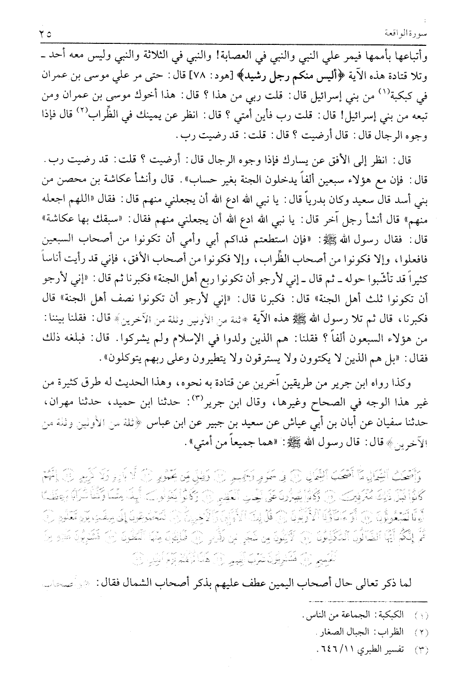 وَأَتْبَاعُهَا بِأُمَمِهَا فَيَمُرُّ عَلَيَّ النَّبِيُّ وَالنَّبِيُّ فِي العصابة! والنبي في الثلاثة والنبي وليس مَعَهُ أَحَدٌ- وَتَلَا قَتَادَةُ هَذِهِ الْآيَةَ أَلَيْسَ مِنْكُمْ رَجُلٌ رَشِيدٌ [هُودٍ: 78] قَالَ: حَتَّى مَرَّ عَلَيَّ مُوسَى بْنُ عِمْرَانَ فِي كَبْكَبَةٍ «1» مِنْ بَنِي إِسْرَائِيلَ قَالَ: قُلْتُ رَبِّي مَنْ هَذَا؟ قَالَ: هَذَا أَخُوكَ مُوسَى بْنُ عِمْرَانَ وَمَنْ تبعه مِنْ بَنِي إِسْرَائِيلَ! قَالَ: قُلْتُ رَبِّ فَأَيْنَ أُمَّتِي؟ قَالَ: انْظُرْ عَنْ يَمِينِكَ فِي الظِّرَابِ «2» قَالَ فَإِذَا وُجُوهُ الرِّجَالِ قَالَ: قَالَ أَرَضِيتَ؟ قَالَ: قُلْتُ: قَدْ رَضِيتُ رَبِّ.