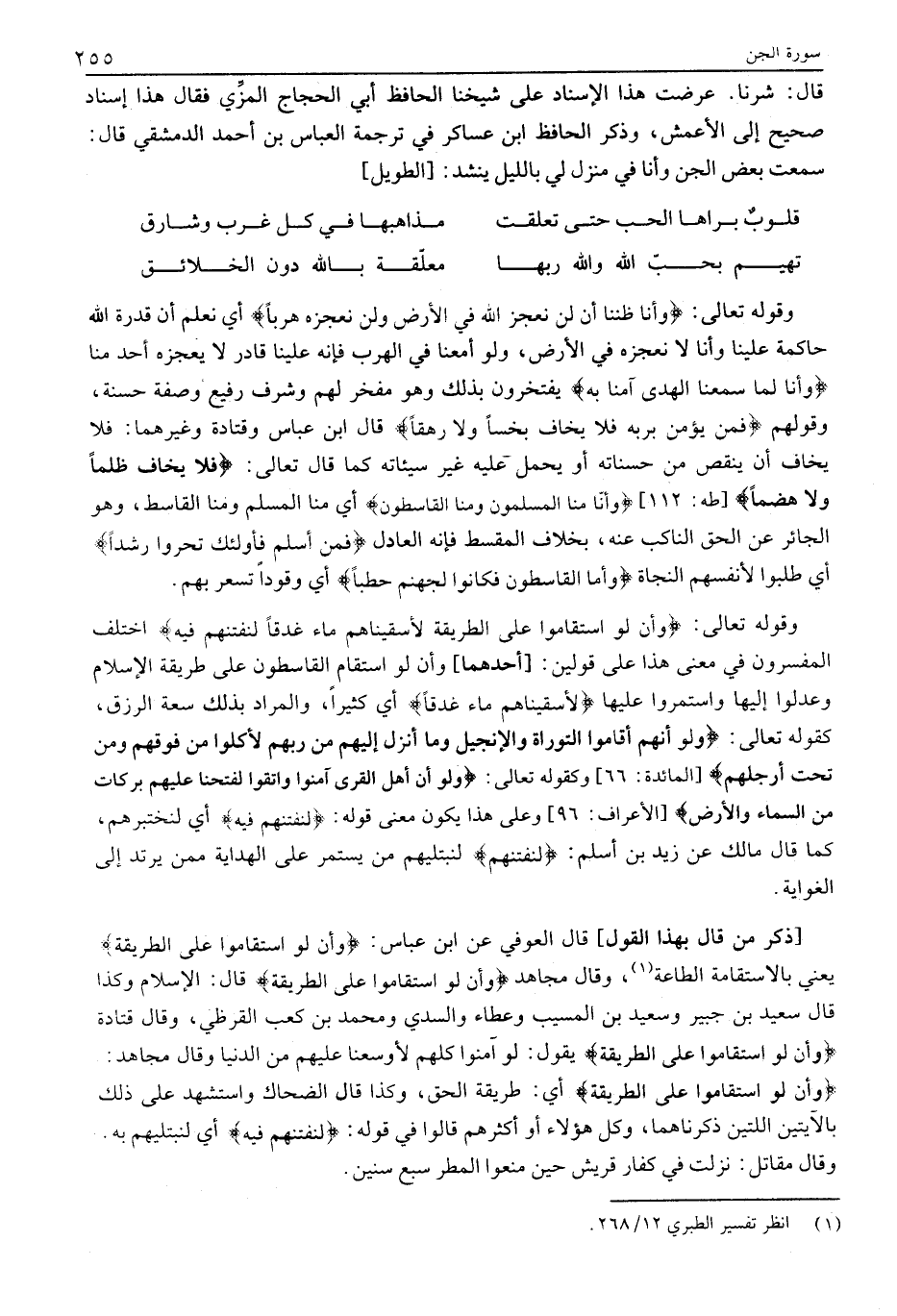 وَأَنْ لَوِ اسْتَقامُوا عَلَى الطَّرِيقَةِ أَيْ: طَرِيقَةِ الْحَقِّ، وَكَذَا قَالَ الضَّحَّاكُ وَاسْتَشْهَدَ عَلَى ذَلِكَ بِالْآيَتَيْنِ اللَّتَيْنِ ذَكَرْنَاهُمَا، وَكُلُّ هَؤُلَاءِ أَوْ أَكْثَرُهُمْ قَالُوا فِي قَوْلِهِ: لِنَفْتِنَهُمْ فِيهِ أَيْ لِنَبْتَلِيَهُمْ بِهِ.