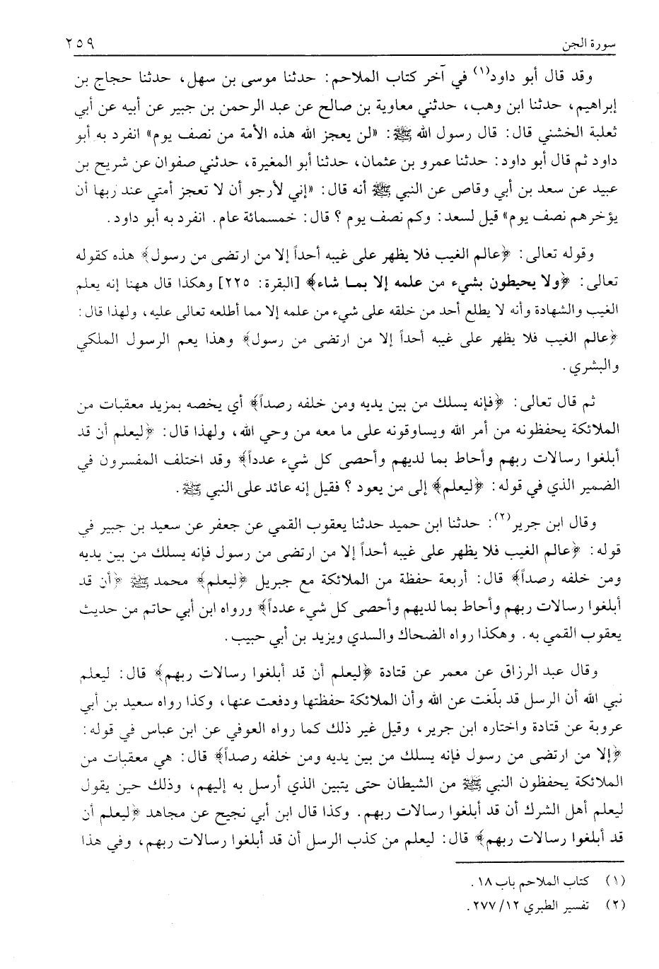 وَقَالَ ابْنُ جَرِيرٍ «2» : حَدَّثَنَا ابْنُ حُمَيْدٍ حَدَّثَنَا يَعْقُوبُ الْقُمِّيُّ عَنْ جَعْفَرٍ عَنْ سَعِيدِ بْنِ جُبَيْرٍ فِي قَوْلِهِ: عالِمُ الْغَيْبِ فَلا يُظْهِرُ عَلى غَيْبِهِ أَحَداً إِلَّا مَنِ ارْتَضى مِنْ رَسُولٍ فَإِنَّهُ يَسْلُكُ مِنْ بَيْنِ يَدَيْهِ وَمِنْ خَلْفِهِ رَصَداً قَالَ: أَرْبَعَةُ حَفَظَةٍ مِنَ الْمَلَائِكَةِ مَعَ جِبْرِيلَ لِيَعْلَمَ مُحَمَّدٌ صَلَّى اللَّهُ عَلَيْهِ وَسَلَّمَ أَنْ قَدْ أَبْلَغُوا رِسالاتِ رَبِّهِمْ وَأَحاطَ بِما لَدَيْهِمْ وَأَحْصى كُلَّ شَيْءٍ عَدَداً وَرَوَاهُ ابْنُ أَبِي حَاتِمٍ مِنْ حَدِيثِ يَعْقُوبَ الْقَمِّيِّ بِهِ. وَهَكَذَا رَوَاهُ الضَّحَّاكُ وَالسُّدِّيُّ وَيَزِيدُ بْنُ أَبِي حَبِيبٍ.