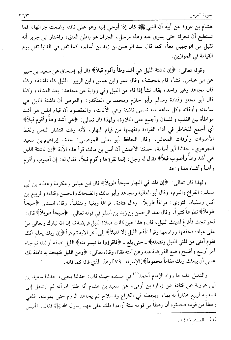 وقوله تعالى: إِنَّ ناشِئَةَ اللَّيْلِ هِيَ أَشَدُّ وَطْئاً وَأَقْوَمُ قِيلًا قَالَ أَبُو إِسْحَاقَ عَنْ سَعِيدِ بْنِ جُبَيْرٍ عَنِ ابْنِ عَبَّاسٍ: نَشَأَ، قَامَ بِالْحَبَشَةِ، وَقَالَ عُمَرُ وَابْنُ عَبَّاسٍ وَابْنُ الزُّبَيْرِ: اللَّيْلُ كُلُّهُ نَاشِئَةٌ، وَكَذَا قَالَ مُجَاهِدٌ وَغَيْرُ وَاحِدٍ، يُقَالُ نَشَأَ إِذَا قَامَ مِنَ اللَّيْلِ وَفِي رِوَايَةٍ عَنْ مُجَاهِدٍ: بَعْدَ الْعِشَاءِ، وَكَذَا قَالَ أَبُو مِجْلَزٍ وَقَتَادَةُ وَسَالِمٌ وَأَبُو حَازِمٍ وَمُحَمَّدُ بْنُ الْمُنْكَدِرُ: وَالْغَرَضُ أَنَّ نَاشِئَةَ اللَّيْلِ هِيَ سَاعَاتُهُ وَأَوْقَاتُهُ وَكُلُّ سَاعَةٍ مِنْهُ تُسَمَّى نَاشِئَةً وَهِيَ الْآنَّاتُ، وَالْمَقْصُودُ أَنَّ قِيَامَ اللَّيْلِ هُوَ أَشَدُّ مُوَاطَأَةً بَيْنَ الْقَلْبِ وَاللِّسَانِ وَأَجْمَعُ عَلَى التلاوة، ولهذا قال تعالى: هِيَ أَشَدُّ وَطْئاً وَأَقْوَمُ قِيلًا أَيْ أَجْمَعُ لِلْخَاطِرِ فِي أَدَاءِ الْقِرَاءَةِ وَتَفَهُّمِهَا مِنْ قِيَامِ النَّهَارِ، لِأَنَّهُ وَقْتُ انْتِشَارِ النَّاسِ وَلَغَطِ الْأَصْوَاتِ وأوقات المعاش، وقال الْحَافِظُ أَبُو يَعْلَى الْمَوْصِلِيُّ: حَدَّثَنَا إِبْرَاهِيمُ بْنُ سَعِيدٍ الْجَوْهَرِيُّ، حَدَّثَنَا أَبُو أُسَامَةَ، حَدَّثَنَا الْأَعْمَشُ أَنَّ أَنَسَ بْنَ مَالِكٍ قَرَأَ هَذِهِ الْآيَةَ إن ناشئة الليل هي أشد وطأ وَأَصْوَبُ قِيلًا فَقَالَ لَهُ رَجُلٌ: إِنَّمَا نَقْرَؤُهَا وَأَقْوَمُ قِيلًا، فَقَالَ لَهُ: إِنَّ أَصْوَبَ وَأَقْوَمَ وأهيأ وأشباه هذا واحد.