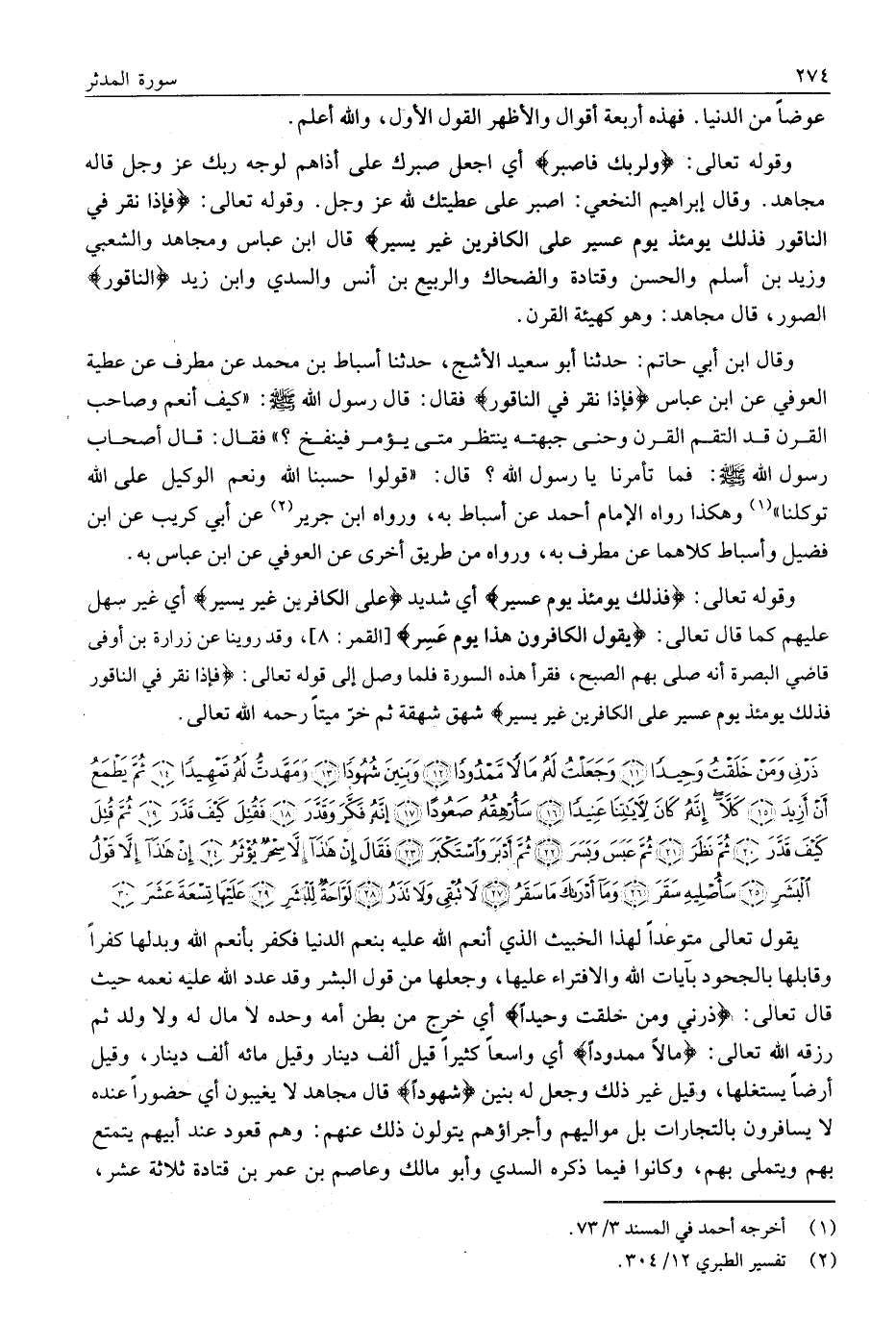 وقوله تعالى: وَلِرَبِّكَ فَاصْبِرْ أَيِ اجْعَلْ صَبْرَكَ عَلَى أَذَاهُمْ لِوَجْهِ رَبِّكَ عَزَّ وَجَلَّ قَالَهُ مُجَاهِدٌ. وَقَالَ إبراهيم النخعي: اصبر على عطيتك لله عز وجل. وقوله تَعَالَى: فَإِذا نُقِرَ فِي النَّاقُورِ فَذلِكَ يَوْمَئِذٍ يَوْمٌ عَسِيرٌ عَلَى الْكافِرِينَ غَيْرُ يَسِيرٍ قَالَ ابْنُ عَبَّاسٍ وَمُجَاهِدٌ وَالشَّعْبِيُّ وَزَيْدُ بْنُ أَسْلَمَ وَالْحَسَنُ وَقَتَادَةُ وَالضَّحَّاكُ وَالرَّبِيعُ بْنُ أَنَسٍ وَالسُّدِّيُّ وَابْنُ زَيْدٍ النَّاقُورِ الصُّورِ، قَالَ مُجَاهِدٌ: وَهُوَ كَهَيْئَةِ الْقَرْنِ.