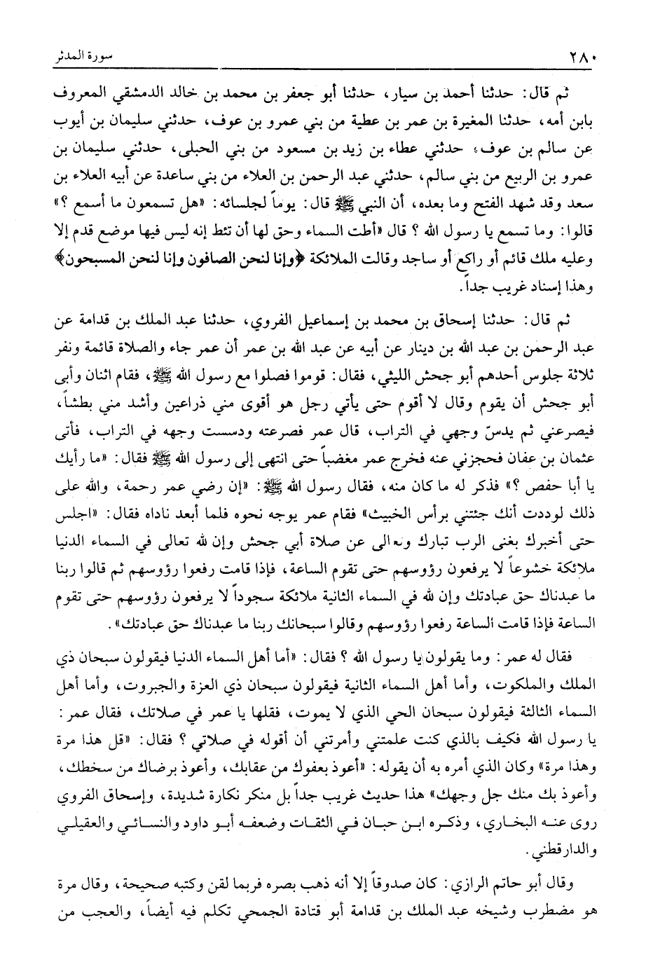 ثُمَّ قَالَ: حَدَّثَنَا إِسْحَاقُ بْنُ مُحَمَّدِ بْنِ إِسْمَاعِيلَ الْفَرَوِيُّ، حَدَّثَنَا عَبْدُ الْمَلِكِ بْنُ قُدَامَةَ عَنْ عَبْدِ الرَّحْمَنِ بْنِ عَبْدِ اللَّهِ بْنِ دِينَارٍ عَنْ أَبِيهِ عَنْ عَبْدِ اللَّهِ بْنِ عُمَرَ أَنَّ عُمَرَ جَاءَ وَالصَّلَاةُ قَائِمَةٌ وَنَفَرٌ ثَلَاثَةٌ جُلُوسٌ أَحَدُهُمْ أَبُو جَحْشٍ اللَّيْثِيُّ، فَقَالَ: قُومُوا فَصَّلُوا مَعَ رَسُولِ اللَّهِ صَلَّى اللَّهُ عَلَيْهِ وَسَلَّمَ، فَقَامَ اثْنَانِ وَأَبَى أَبُو جَحْشٍ أَنْ يَقُومَ وَقَالَ لَا أَقُومُ حَتَّى يَأْتِيَ رَجُلٌ هُوَ أَقْوَى مِنِّي ذِرَاعَيْنِ وَأَشَدُّ مِنِّي بَطْشًا، فَيَصْرَعُنِي ثُمَّ يَدُسُّ وَجْهِي فِي التُّرَابِ، قَالَ عُمَرُ فَصَرَعْتُهُ وَدَسَسْتُ وَجْهَهُ فِي التُّرَابِ، فَأَتَى عُثْمَانُ بْنُ عَفَّانَ فَحَجَزَنِي عَنْهُ فَخَرَجَ عُمَرُ مُغْضَبًا حَتَّى انْتَهَى إِلَى رَسُولِ اللَّهِ صَلَّى اللَّهُ عَلَيْهِ وَسَلَّمَ فَقَالَ: «مَا رَأْيُكَ يَا أَبَا حَفْصٍ؟» فَذَكَرَ لَهُ مَا كَانَ مِنْهُ، فَقَالَ رَسُولُ اللَّهِ صَلَّى اللَّهُ عَلَيْهِ وَسَلَّمَ: «إن رضي عمر رحمة، والله على ذلك لَوَدِدْتُ أَنَّكَ جِئْتَنِي بِرَأْسِ الْخَبِيثِ» فَقَامَ عُمَرُ يُوَجَّهُ نَحْوَهُ فَلَمَّا أَبْعَدَ نَادَاهُ فَقَالَ: «اجْلِسْ حتى أخبرك بغنى الرب تبارك وتعالى عن صلاة أبي جحش وإن لله تعالى فِي السَّمَاءِ الدُّنْيَا مَلَائِكَةً خُشُوعًا لَا يَرْفَعُونَ رؤوسهم حتى تقوم الساعة، فإذا قامت رفعوا رؤوسهم ثُمَّ قَالُوا رَبَّنَا مَا عَبَدْنَاكَ حَقَّ عِبَادَتِكَ وَإِنَّ لِلَّهِ فِي السَّمَاءِ الثَّانِيَةِ مَلَائِكَةً سُجُودًا لا يرفعون رؤوسهم حَتَّى تَقُومَ السَّاعَةُ فَإِذَا قَامَتِ السَّاعَةُ رَفَعُوا رؤوسهم وقالوا سبحانك ربنا مَا عَبَدْنَاكَ حَقَّ عِبَادَتِكَ» .