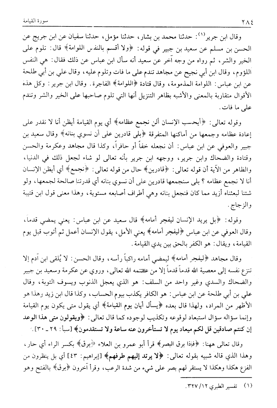 وَقَالَ ابْنُ جَرِيرٍ «1» : حَدَّثَنَا مُحَمَّدُ بْنُ بَشَّارٍ، حَدَّثَنَا مُؤَمَّلٌ، حَدَّثَنَا سُفْيَانُ عَنِ ابْنِ جُرَيْجٍ عَنِ الْحَسَنِ بْنِ مُسْلِمٍ عَنْ سَعِيدِ بْنِ جُبَيْرٍ فِي قَوْلِهِ: وَلا أُقْسِمُ بِالنَّفْسِ اللَّوَّامَةِ قَالَ: تَلُومُ عَلَى الْخَيْرِ وَالشَّرِّ، ثُمَّ رَوَاهُ مِنْ وَجْهٍ آخَرَ عَنْ سَعِيدٍ أَنَّهُ سَأَلَ ابْنَ عباس عن ذلك فقال: هي النفس اللؤوم، وقال ابن أَبِي نَجِيحٍ عَنْ مُجَاهِدٍ تَنْدَمُ عَلَى مَا فَاتَ وَتَلُومُ عَلَيْهِ، وَقَالَ عَلِيُّ بْنُ أَبِي طَلْحَةَ عَنِ ابْنِ عَبَّاسٍ: اللَّوَّامَةُ الْمَذْمُومَةُ، وَقَالَ قتادة اللَّوَّامَةِ الفاجرة. وقال ابن جرير: وكل هذه الأقوال متقاربة بالمعنى والأشبه بِظَاهِرِ التَّنْزِيلِ أَنَّهَا الَّتِي تَلُومُ صَاحِبَهَا عَلَى الْخَيْرِ وَالشَّرِّ وَتَنْدَمُ عَلَى مَا فَاتَ.