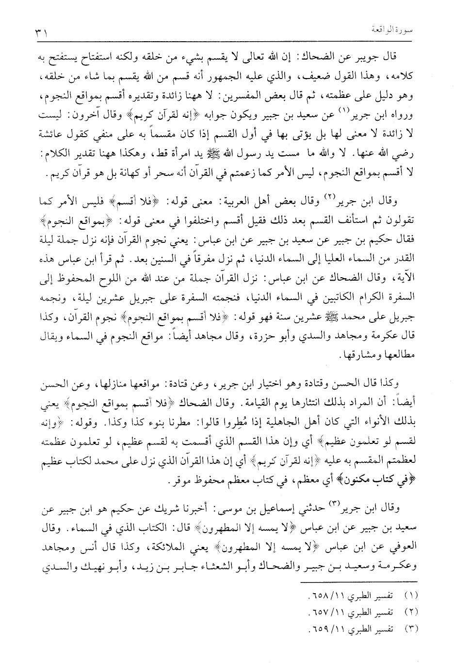 لَا أُقْسِمُ بِمَوَاقِعِ النُّجُومِ، لَيْسَ الْأَمْرُ كَمَا زَعَمْتُمْ فِي الْقُرْآنِ أَنَّهُ سِحْرٌ أَوْ كِهَانَةٌ بَلْ هُوَ قُرْآنٌ كَرِيمٌ.