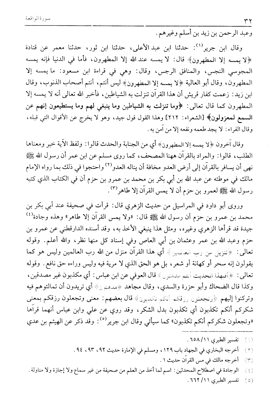 وَرَوَى أَبُو دَاوُدَ فِي الْمَرَاسِيلِ مِنْ حَدِيثِ الزُّهْرِيِّ قَالَ: قَرَأْتُ فِي صَحِيفَةٍ عِنْدَ أَبِي بَكْرِ بْنِ مُحَمَّدِ بْنِ عَمْرِو بْنِ حَزْمٍ أَنَّ رَسُولَ اللَّهِ صَلَّى اللَّهُ عَلَيْهِ وَسَلَّمَ قَالَ: «وَلَا يَمَسُّ الْقُرْآنَ إِلَّا طَاهِرٌ» وَهَذِهِ وِجَادَةٌ «4» جَيِّدَةٌ قَدْ قَرَأَهَا الزُّهْرِيُّ وَغَيْرُهُ، وَمِثْلُ هَذَا يَنْبَغِي الْأَخْذُ بِهِ، وَقَدْ أَسْنَدَهُ الدَّارَقُطْنِيُّ عَنْ عَمْرِو بْنِ حَزْمٍ وَعَبْدِ اللَّهِ بْنِ عُمَرَ وَعُثْمَانَ بْنِ أَبِي الْعَاصِ وَفِي إِسْنَادِ كُلٍّ مِنْهَا نَظَرٌ، والله أعلم. وقوله تعالى: تَنْزِيلٌ مِنْ رَبِّ الْعالَمِينَ أَيْ هَذَا الْقُرْآنُ مُنَزَّلٌ مِنَ اللَّهِ رَبِّ الْعَالَمِينَ وَلَيْسَ هُوَ كَمَا يَقُولُونَ إِنَّهُ سِحْرٌ أَوْ كِهَانَةٌ أَوْ شِعْرٌ، بَلْ هُوَ الْحَقُّ الَّذِي لَا مِرْيَةَ فيه وليس وراءه حق نافع. وقوله تعالى: أَفَبِهذَا الْحَدِيثِ أَنْتُمْ مُدْهِنُونَ قَالَ الْعَوْفِيُّ عَنِ ابْنِ عَبَّاسٍ: أَيْ مُكَذِّبُونَ غَيْرُ مُصَدِّقِينَ، وَكَذَا قَالَ الضَّحَّاكُ وَأَبُو حَزْرَةَ وَالسُّدِّيُّ، وَقَالَ مُجَاهِدٌ مُدْهِنُونَ أَيْ تُرِيدُونَ أَنْ تُمَالِئُوهُمْ فِيهِ وَتَرْكَنُوا إِلَيْهِمْ وَتَجْعَلُونَ رِزْقَكُمْ أَنَّكُمْ تُكَذِّبُونَ قَالَ بَعْضُهُمْ: معنى وَتَجْعَلُونَ رِزْقَكُمْ بِمَعْنَى شُكْرِكُمْ أَنَّكُمْ تُكَذِّبُونَ أَيْ تُكَذِّبُونَ بَدَلَ الشُّكْرِ، وَقَدْ رُوِيَ عَنْ عَلِيٍّ وابن عباس أنهما قرءاها «وَتَجْعَلُونَ شُكْرَكُمْ أَنَّكُمْ تُكَذِّبُونَ» كَمَا سَيَأْتِي وَقَالَ ابْنُ جَرِيرٍ «5» : وَقَدْ ذُكِرَ عَنِ الْهَيْثَمِ بْنِ عدي